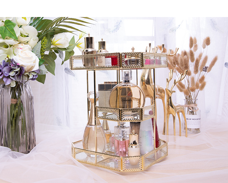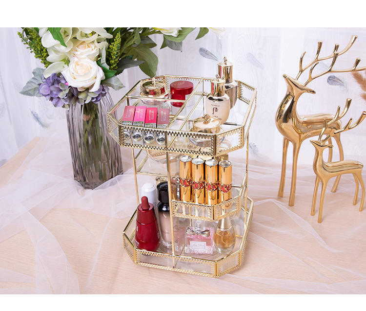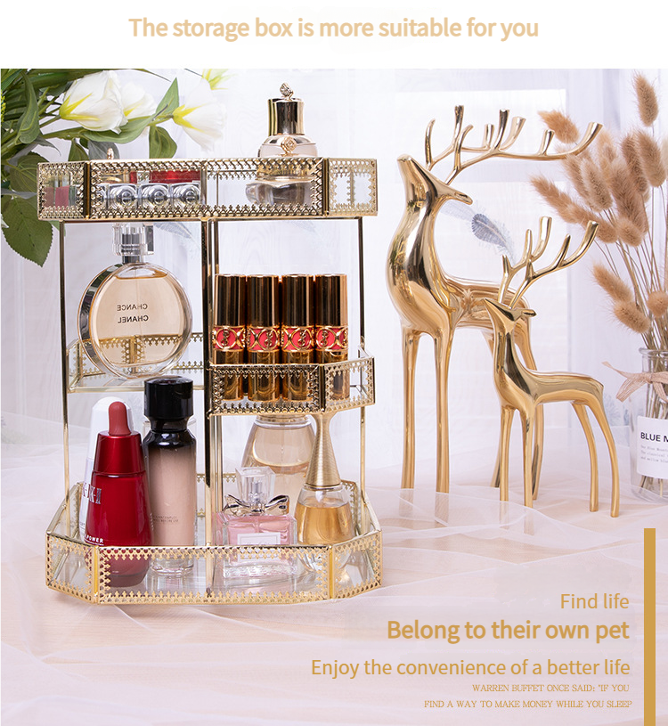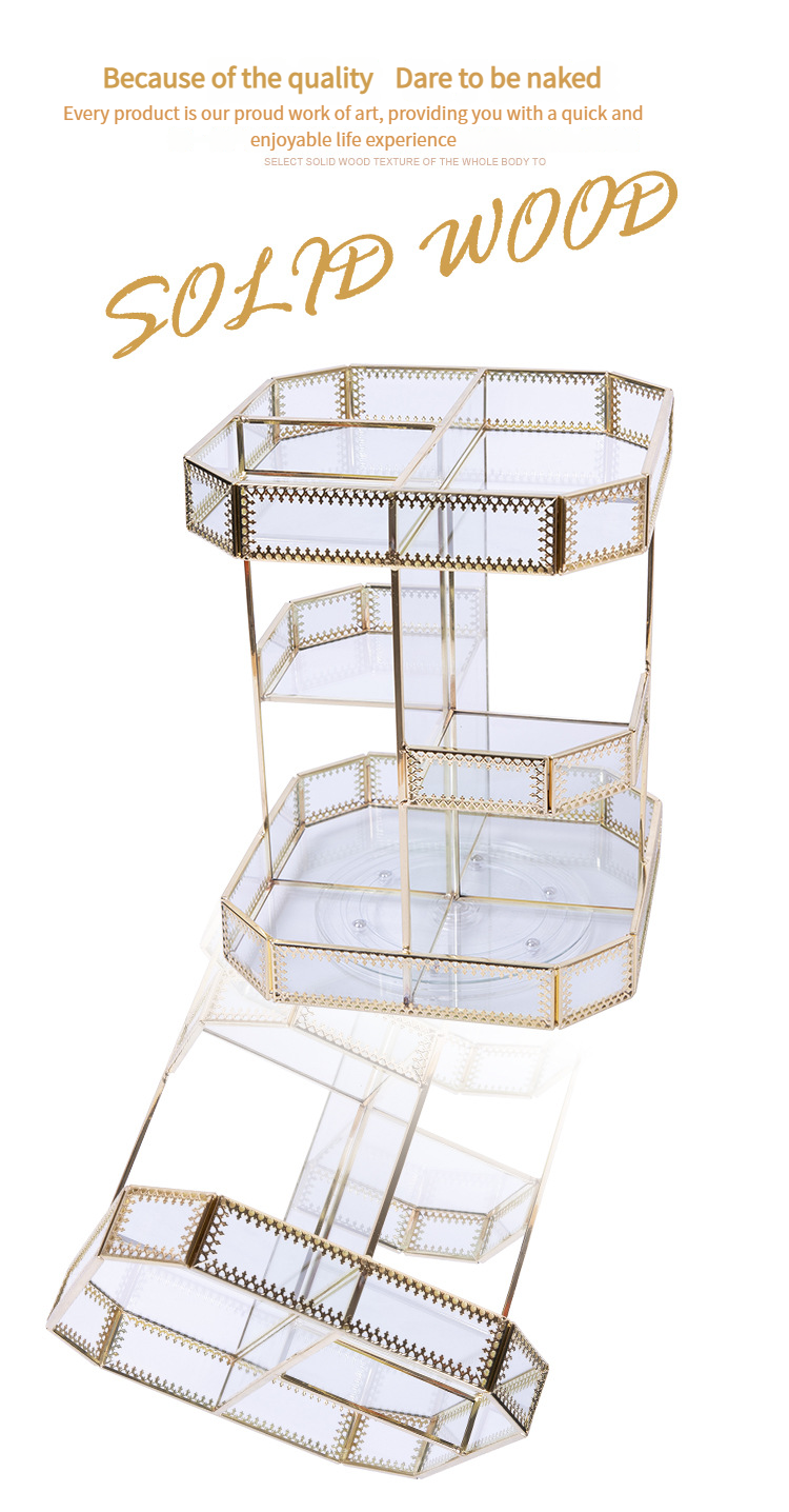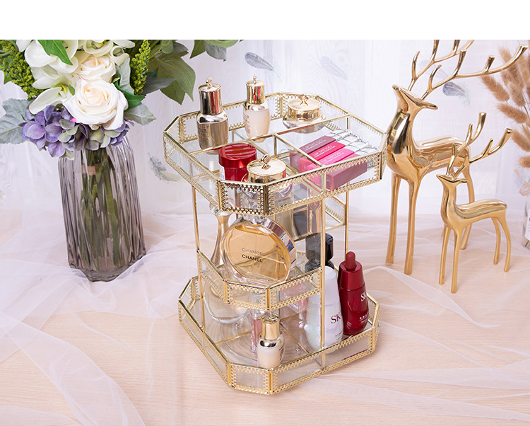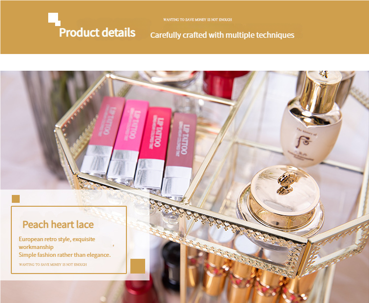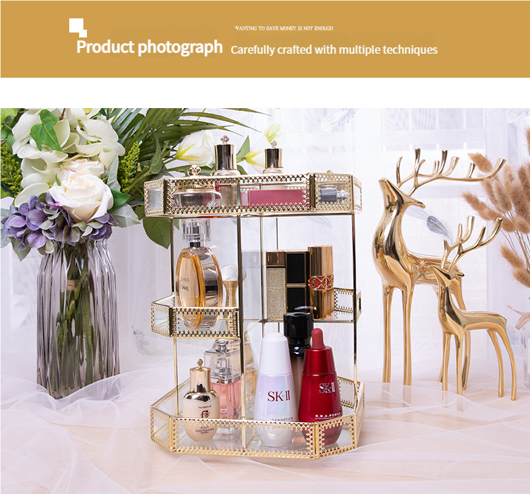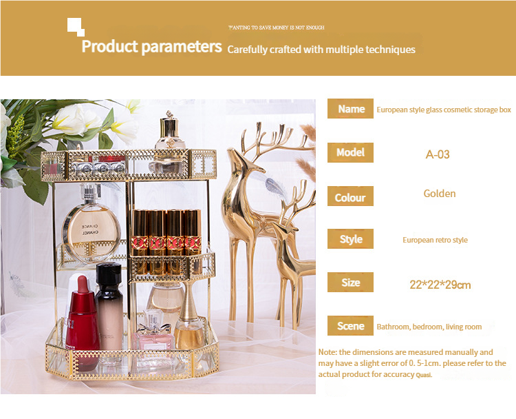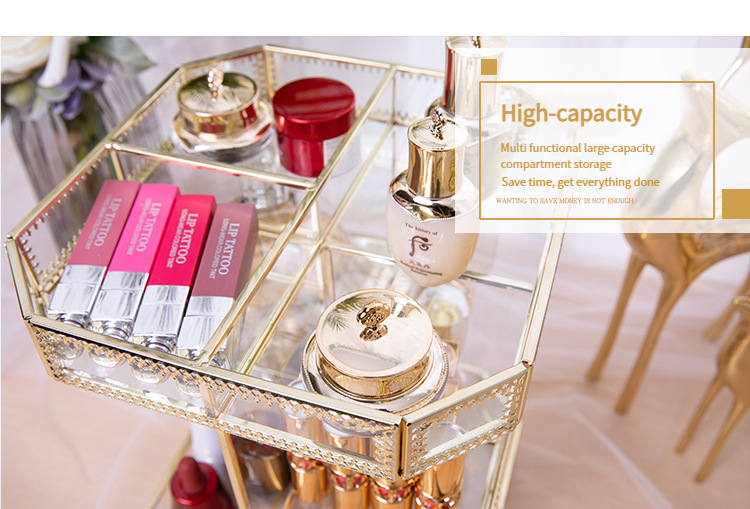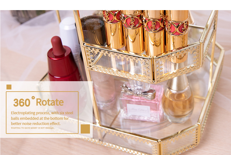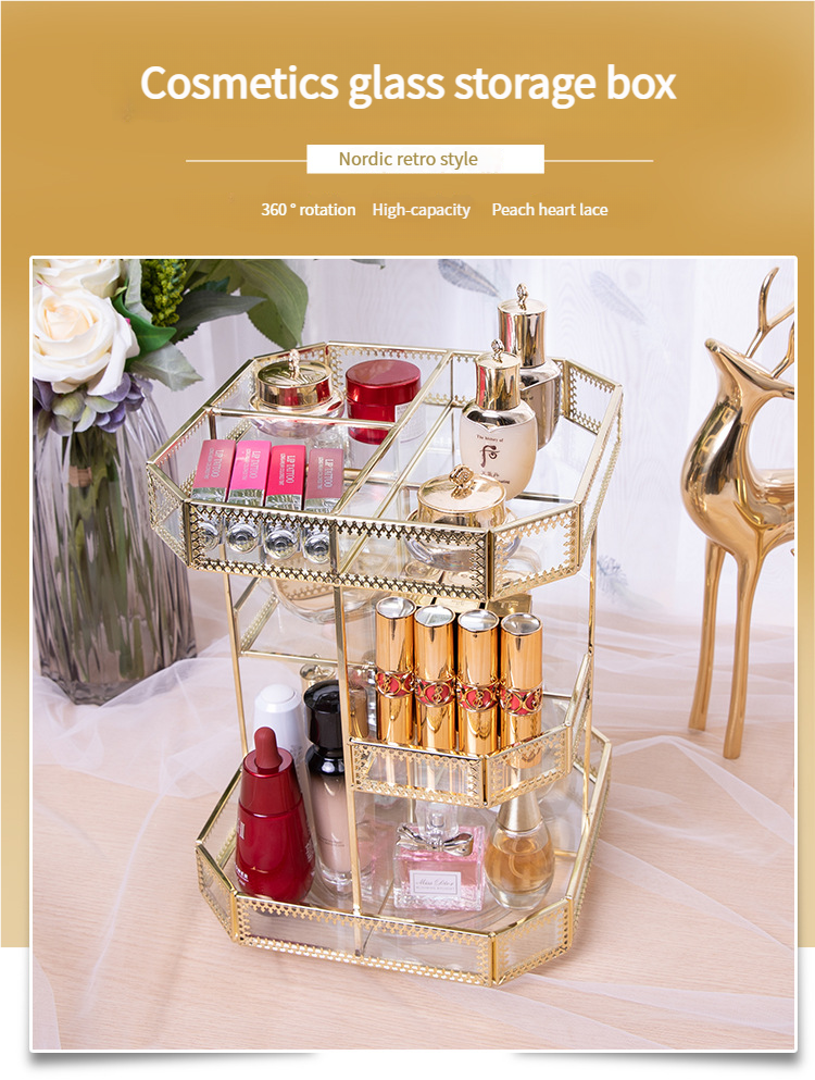 网络知名 360 度旋转玻璃化妆品收纳盒 – 欧式复古梳妆台透明储物架