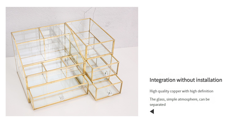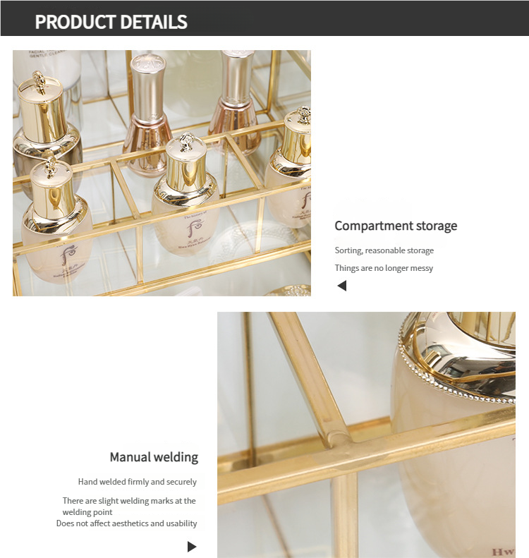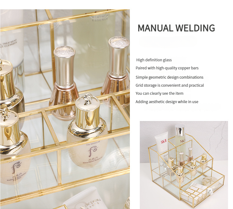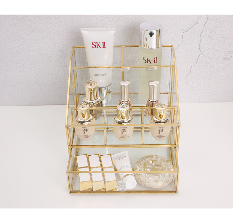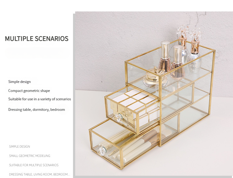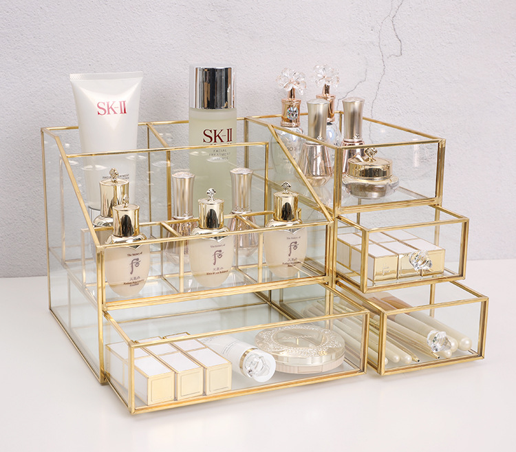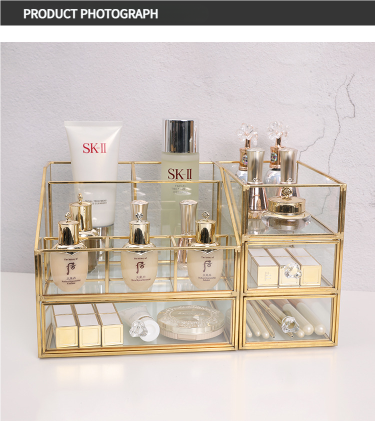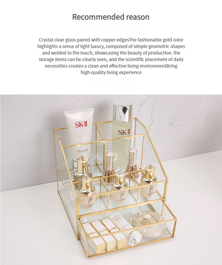 这款多层模块化玻璃化妆品收纳套装采用金色饰边和透明玻璃,营造出轻奢的感觉。 其多隔层设计将护肤品、香水、口红和其他美容产品分类。 它适用于梳妆台,结合了抽屉和开放式储物空间,将实用性与装饰融为一体,保持表面井井有条,增强美容效果。