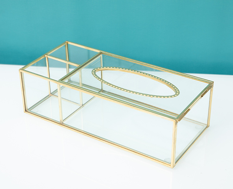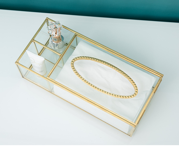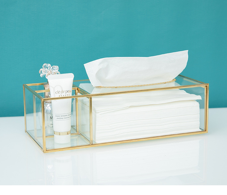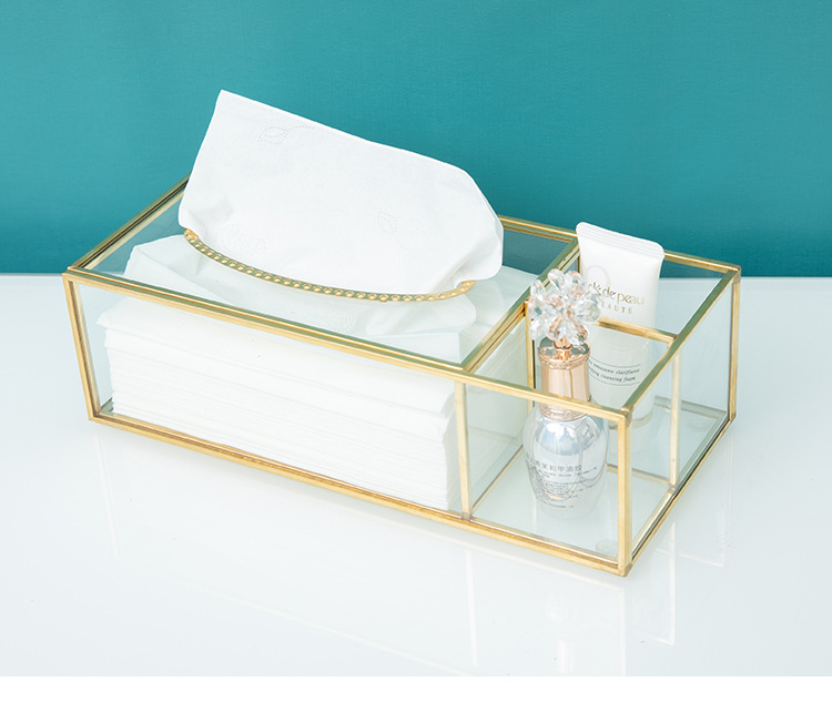 This double – compartment glass tissue box features an exquisite gold frame and transparent material. The large compartment holds tissues, while the small one stores skincare products, perfume bottles and other small items. Suitable for desktop use, it combines storage and decoration, adding a light – luxury touch to the space.