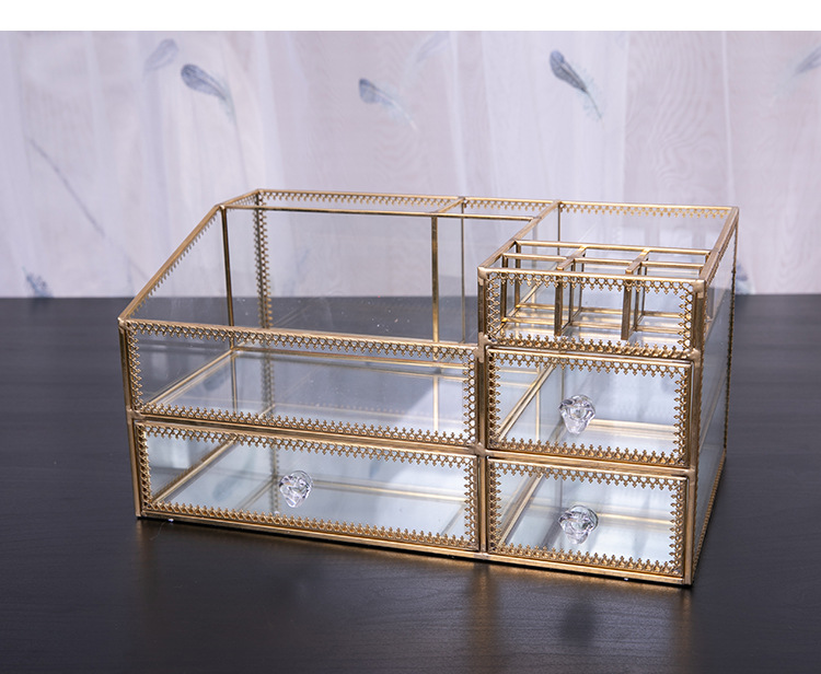 This light – luxury glass cosmetic storage box features an exquisite gold frame and transparent glass. Combining multi – layer drawers with open – style partitions, it can neatly organize beauty products like perfumes, skincare items, and lipsticks. It keeps the dressing table tidy and aesthetic, being a practical item to enhance makeup storage efficiency and the style of the desktop.