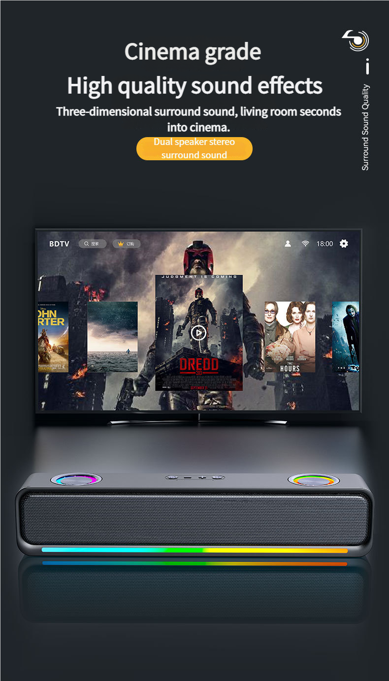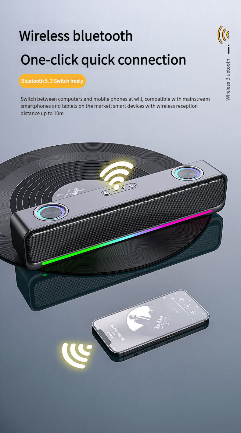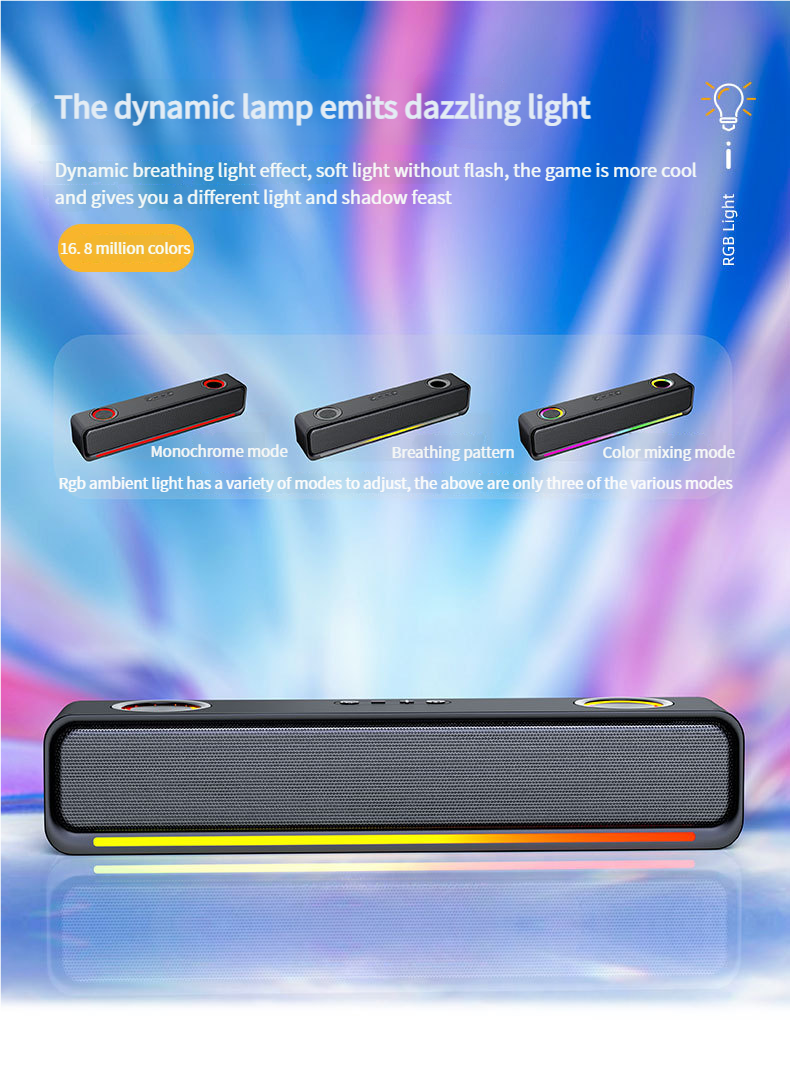 This soundbar features a sleek long – bar design, is equipped with brilliant RGB ambient lights, supports Bluetooth connection, and is suitable for desktop or computer use. It can bring immersive sound and visual experiences to scenarios such as video watching and gaming.