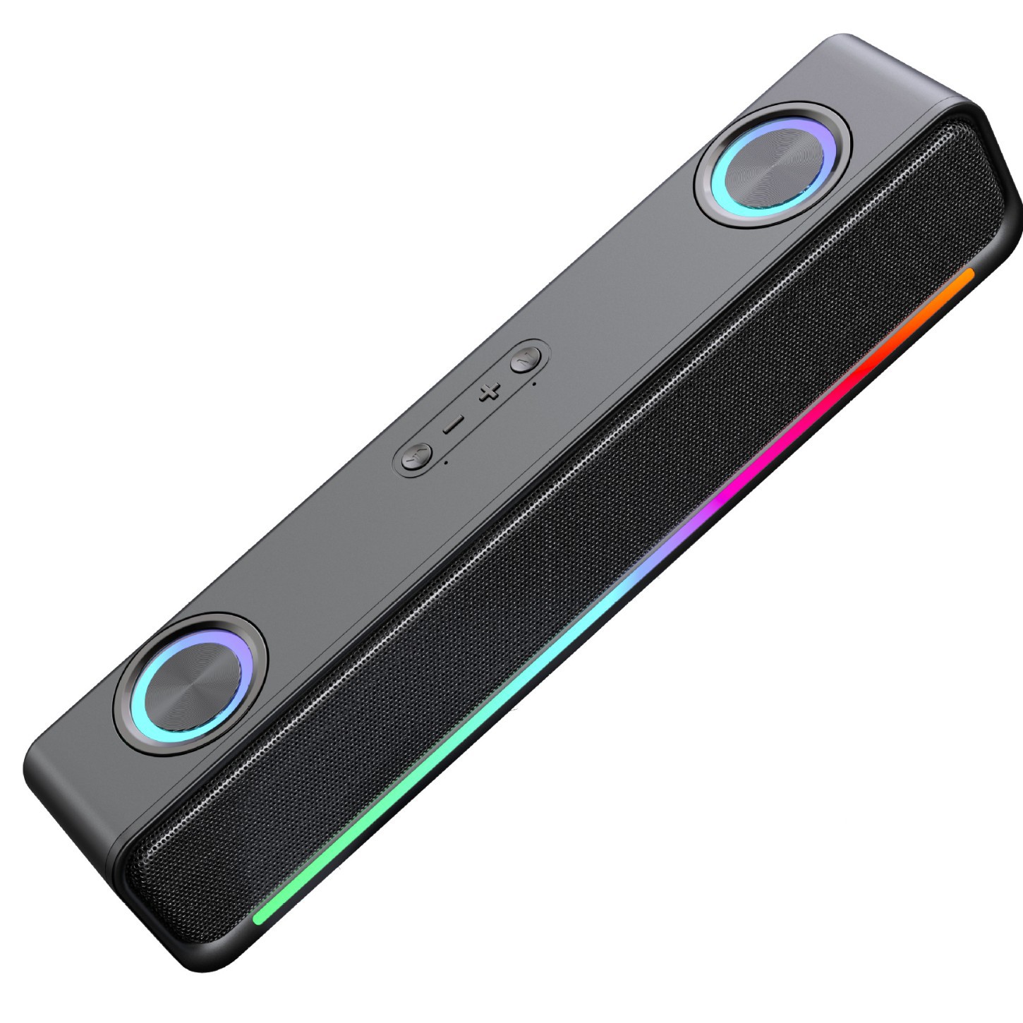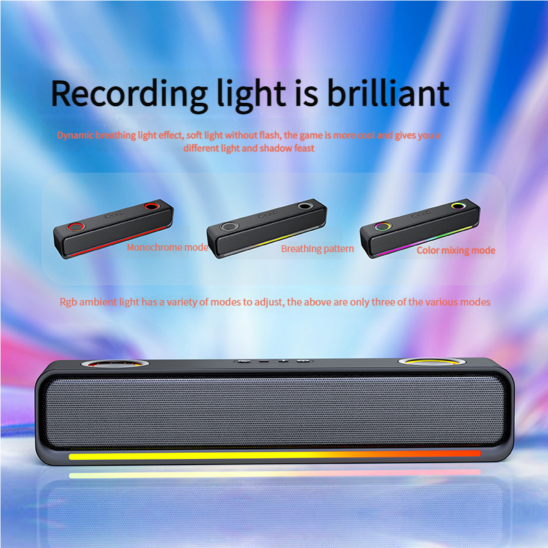 This soundbar features a sleek long – bar design, is equipped with brilliant RGB ambient lights, supports Bluetooth connection, and is suitable for desktop or computer use. It can bring immersive sound and visual experiences to scenarios such as video watching and gaming.