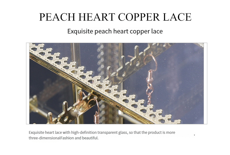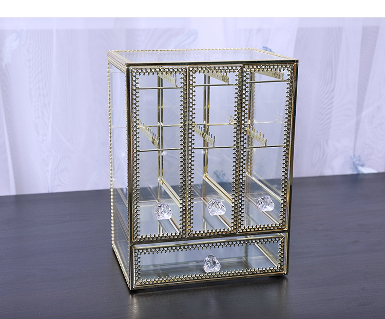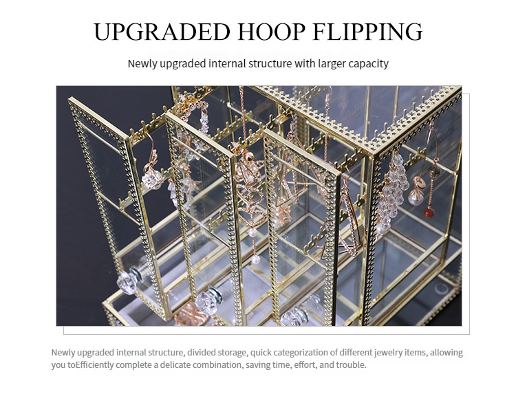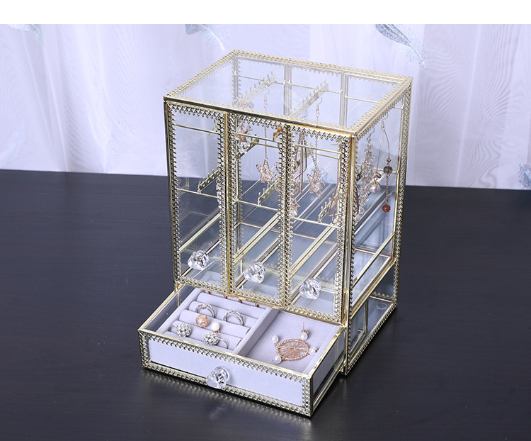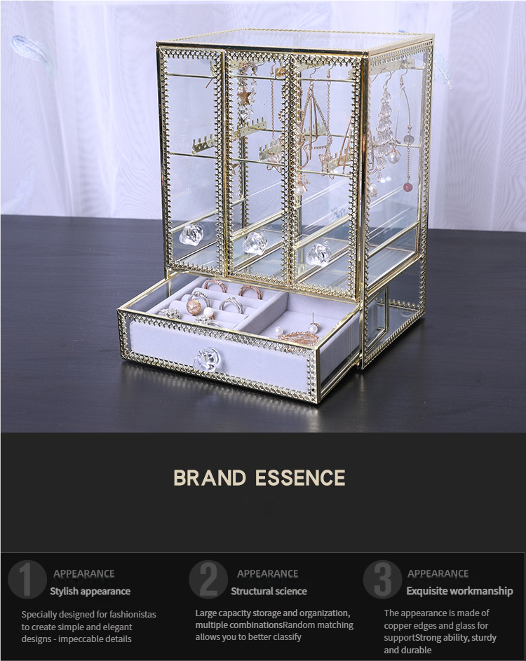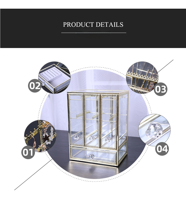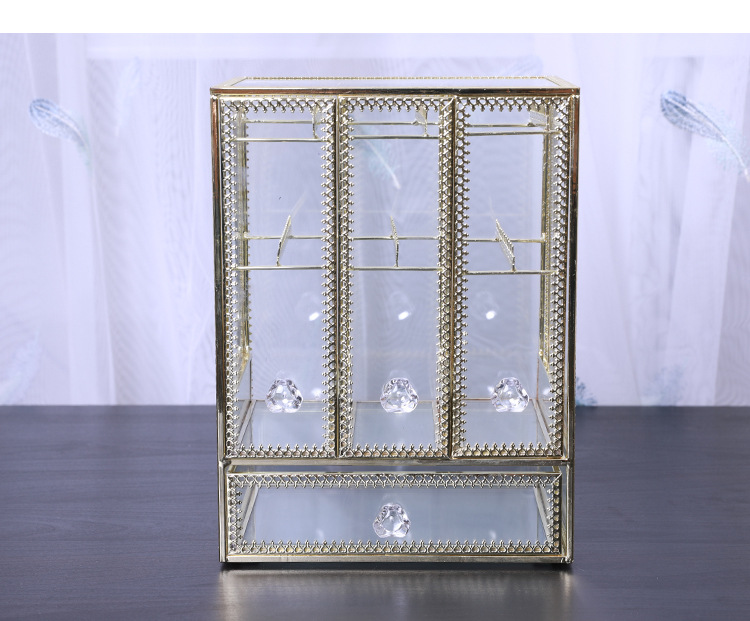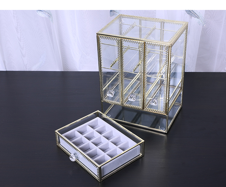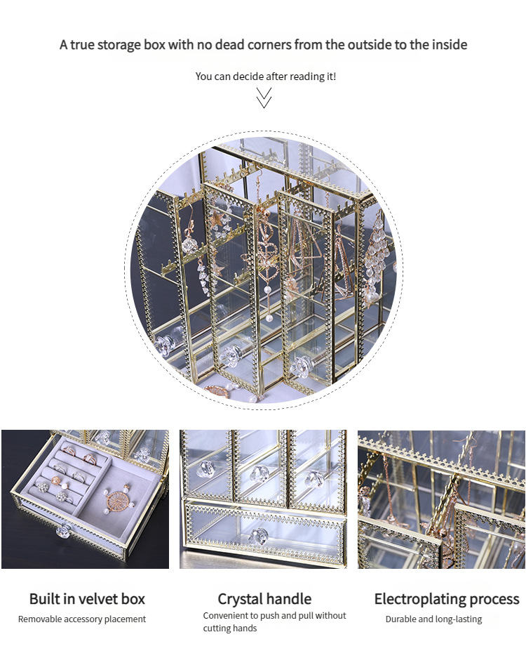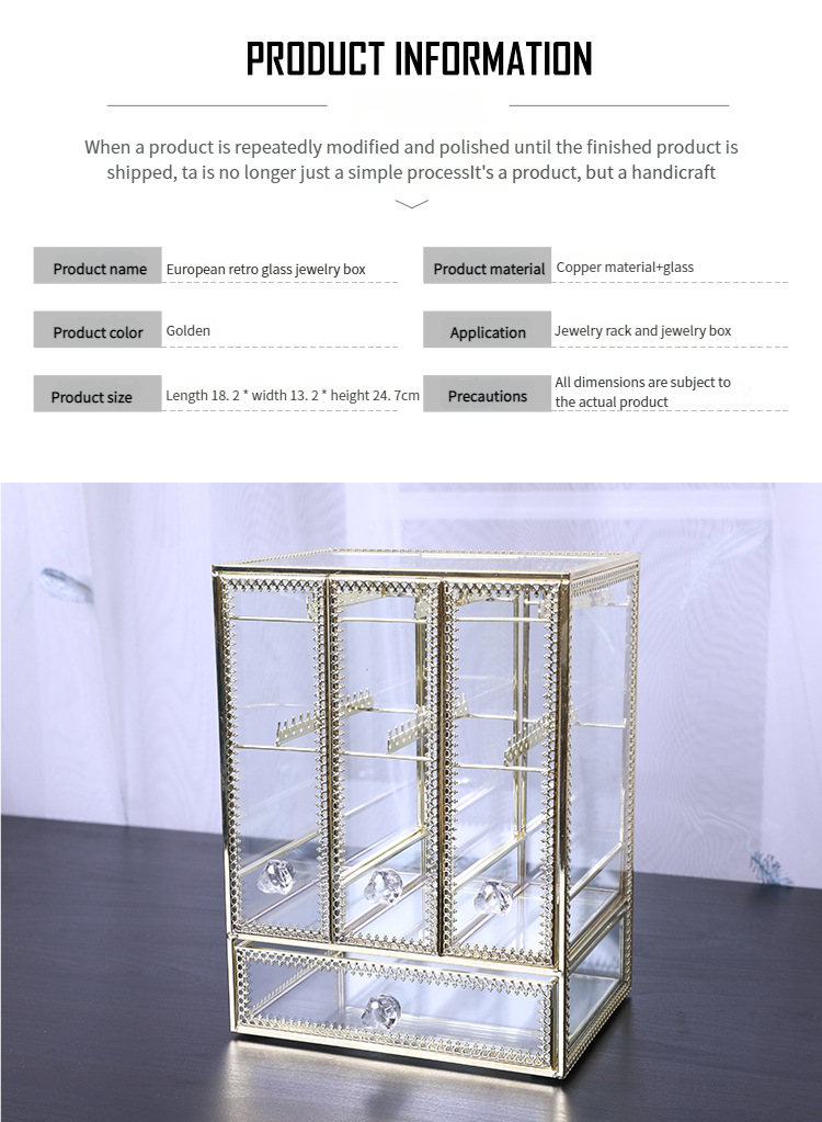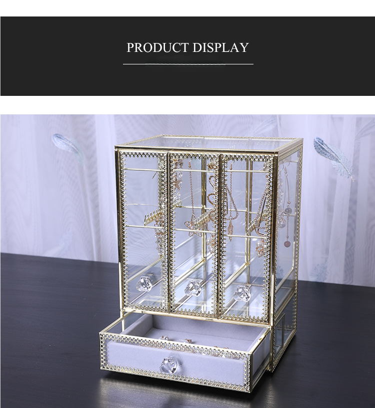 This European light – luxury glass jewelry box has a multi – layer display rack for necklaces and earrings, plus a drawer for small accessories. With a gold frame and transparent glass, it’s dust – proof and elegant, perfect for organizing jewelry on the vanity.