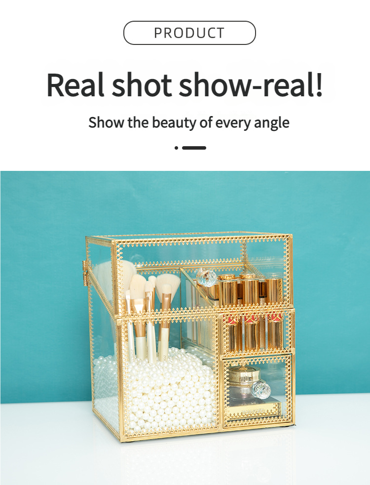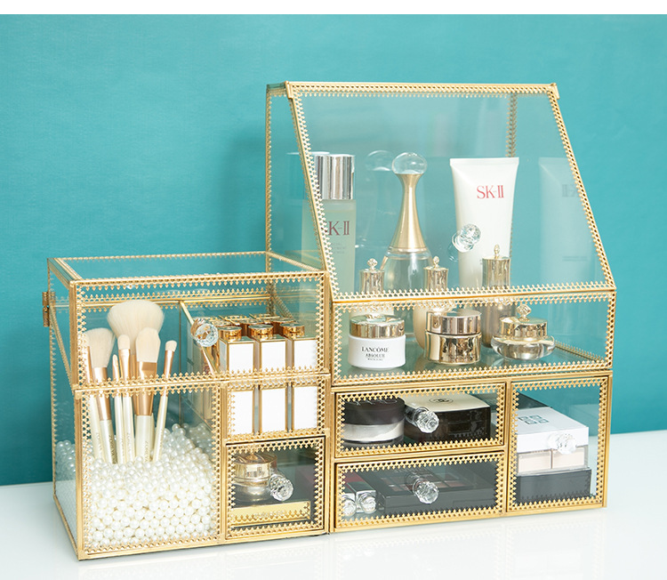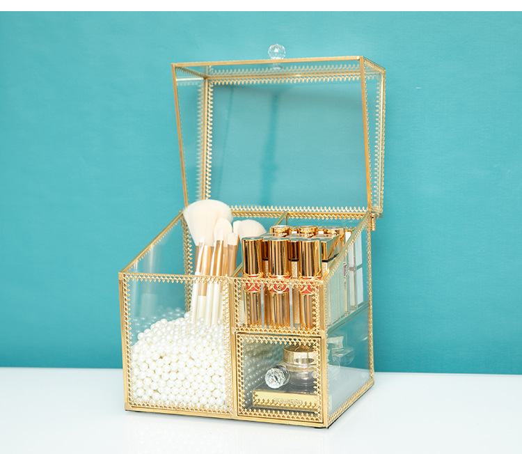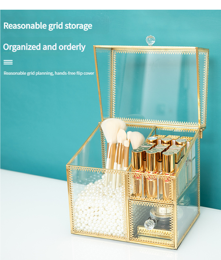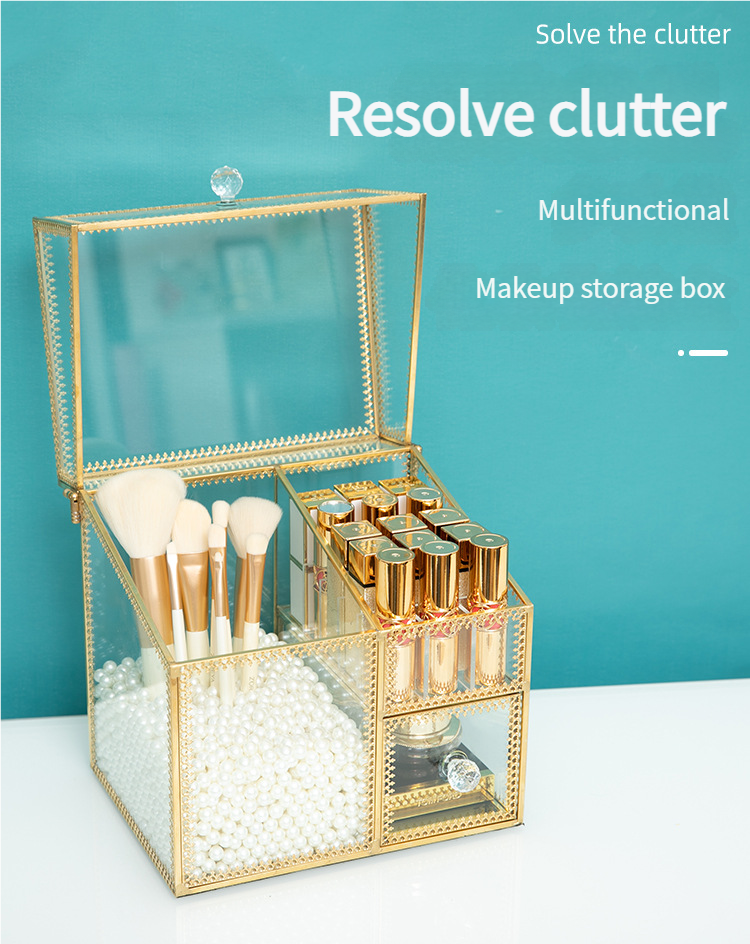 This European – vintage glass makeup storage box features a delicate gold – lace frame. With multi – layer compartments, it can sort and store makeup brushes, lipsticks and other beauty essentials. Transparent and dust – proof, it creates a light – luxury and organized storage space for the vanity.