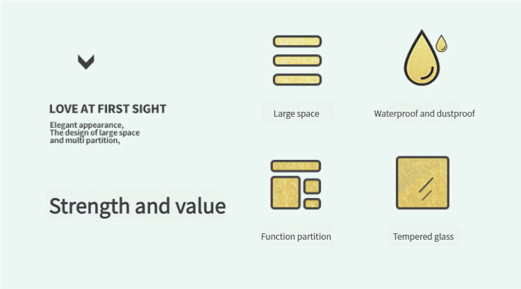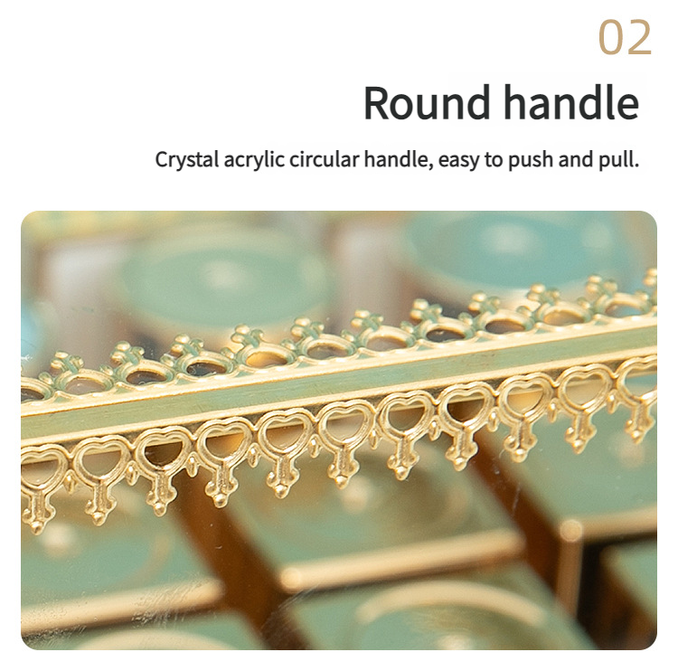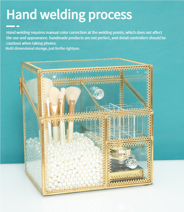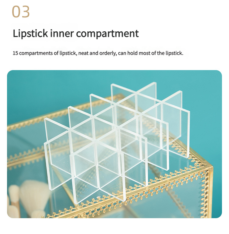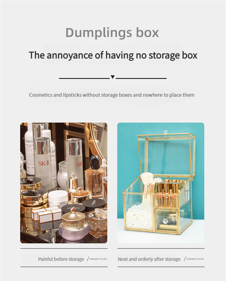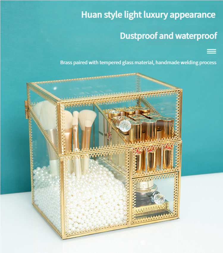 This European – vintage glass makeup storage box features a delicate gold – lace frame. With multi – layer compartments, it can sort and store makeup brushes, lipsticks and other beauty essentials. Transparent and dust – proof, it creates a light – luxury and organized storage space for the vanity.