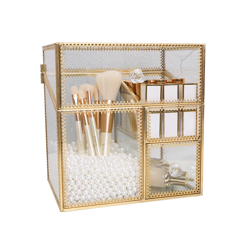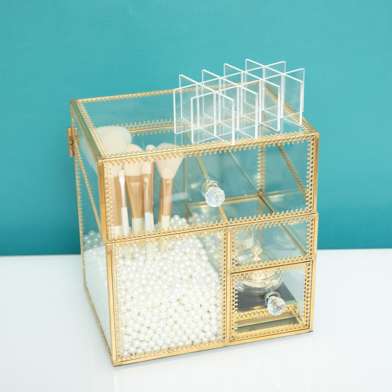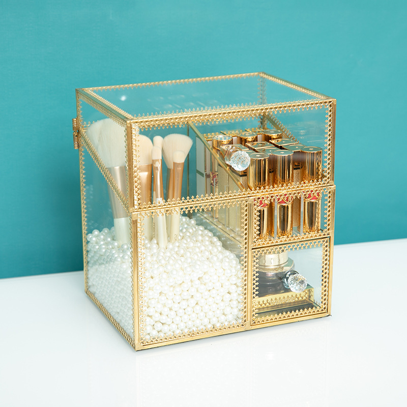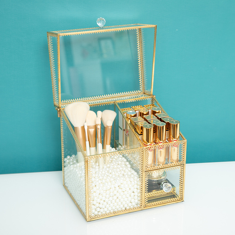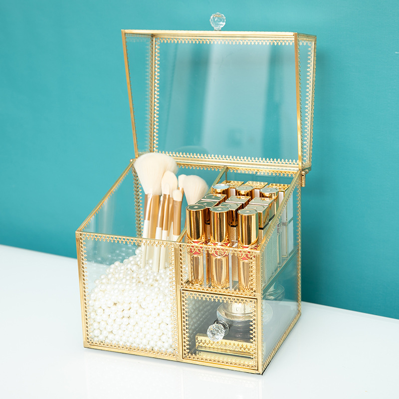 This European – vintage glass makeup storage box features a delicate gold – lace frame. With multi – layer compartments, it can sort and store makeup brushes, lipsticks and other beauty essentials. Transparent and dust – proof, it creates a light – luxury and organized storage space for the vanity.