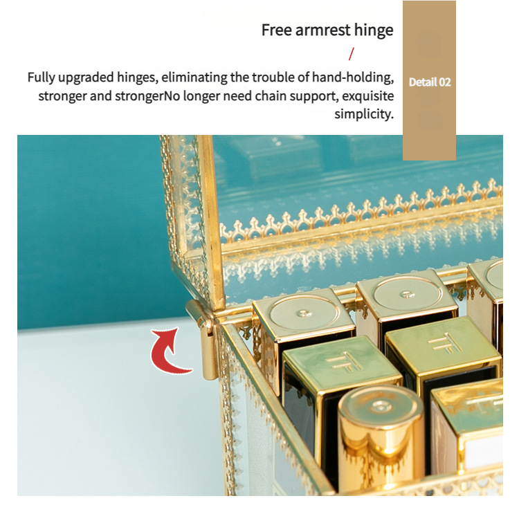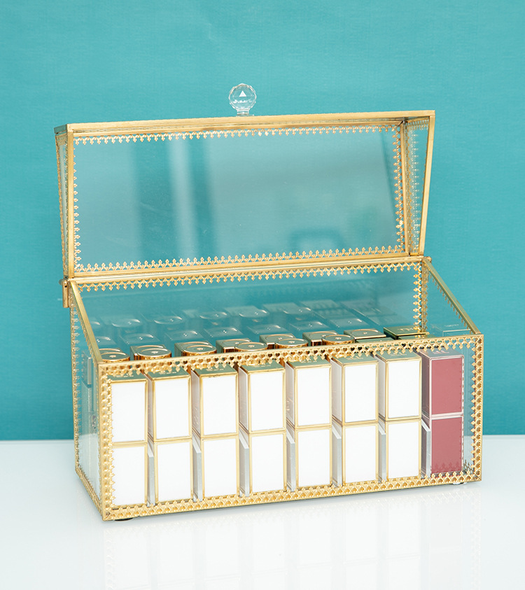 This glass storage box features a delicate gold – engraved frame. With transparent material and a multi – compartment design, it sorts and stores small items like lipsticks and jewelry. The latch design combines dust – proof and display functions, suitable for desks, providing an orderly storage space for beauty products and accessories, and adding a light – luxury vibe.
