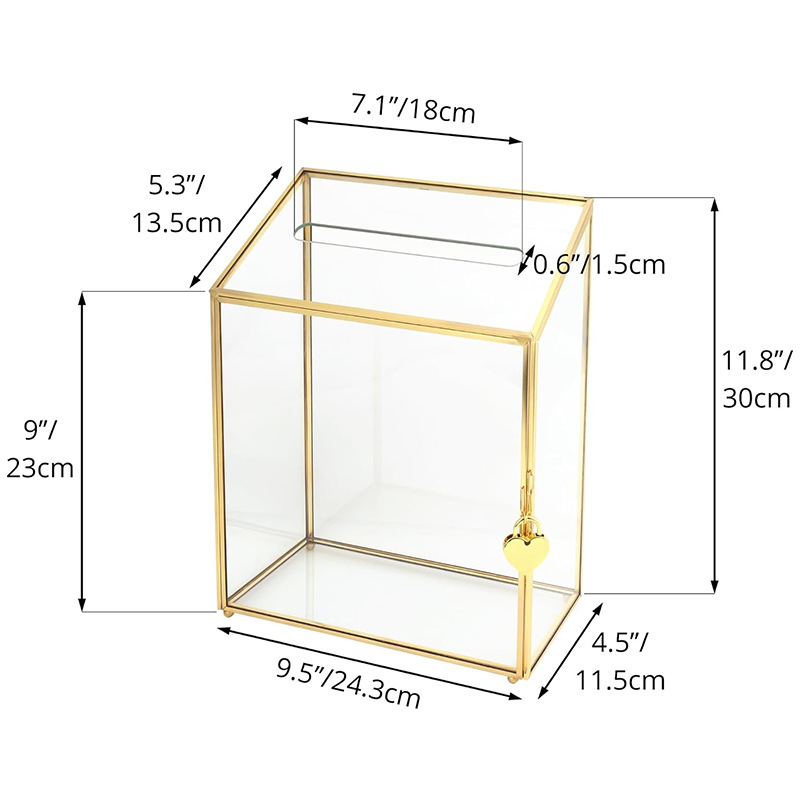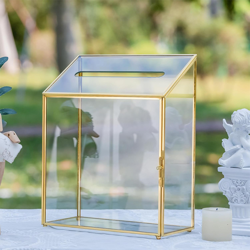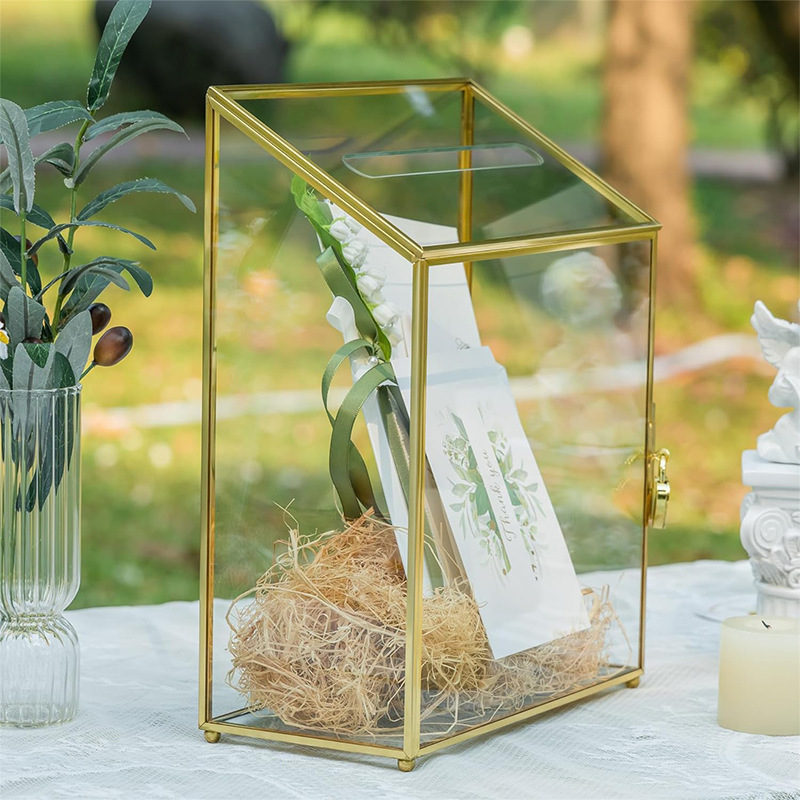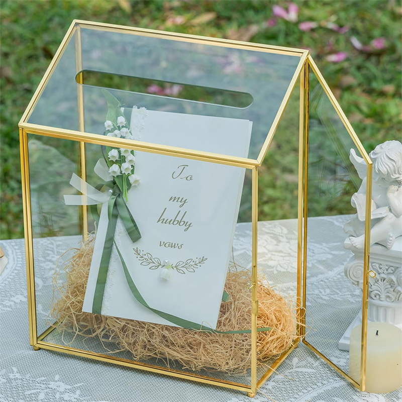 这款金色框架玻璃屋形状的储物盒具有带盖的开放式设计,带有插槽。透明材料清楚地展示了里面的物品。它非常适合婚礼等仪式场景,可存放誓言卡和纪念品,以轻盈奢华的氛围捕捉珍贵时刻。