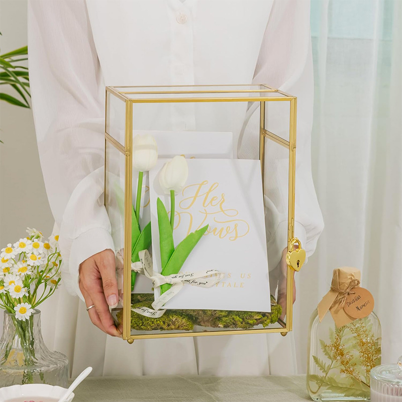 这款方形金色框架玻璃储物盒配有心形锁。其透明设计清楚地展示了里面的物品。它结合了存储和装饰功能,非常适合保存干花、信件和其他贵重物品。轻奢风格为您的桌面增添优雅气息。
