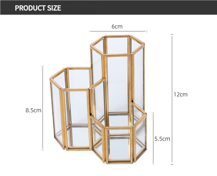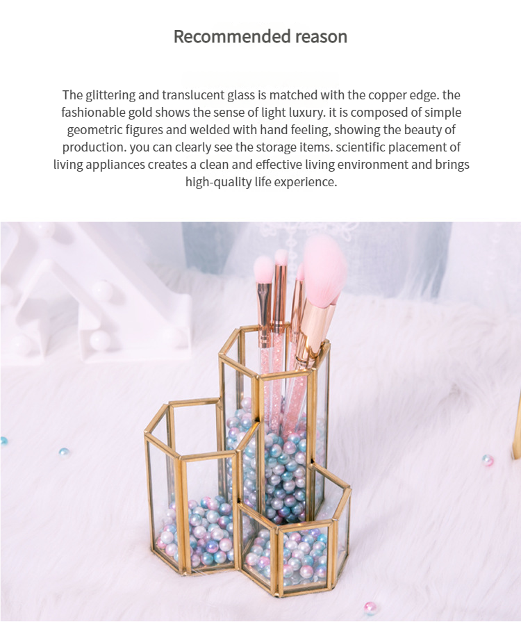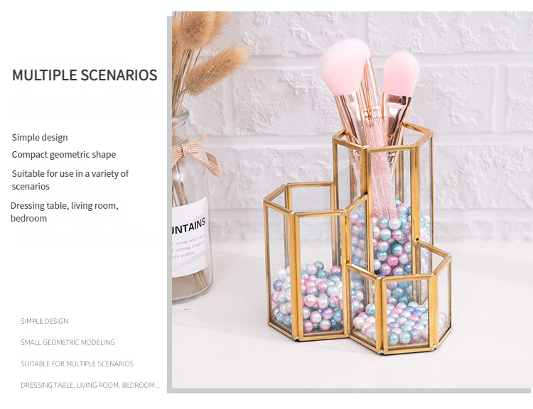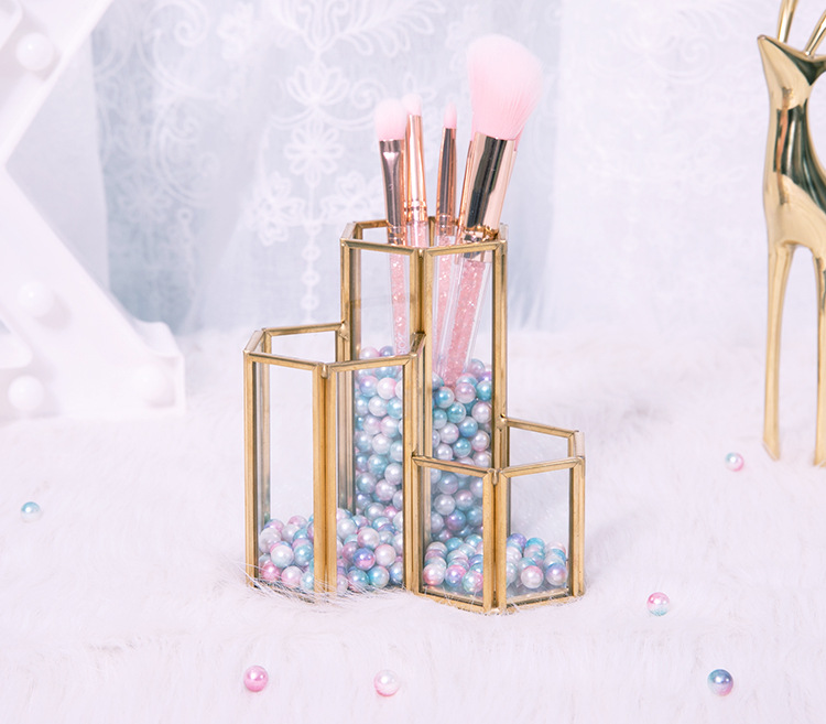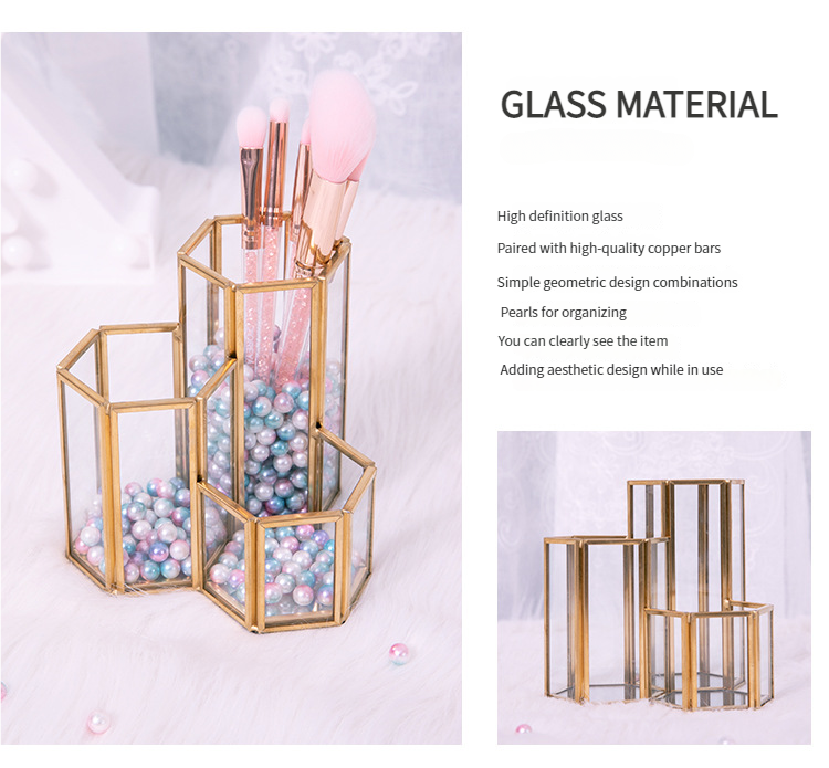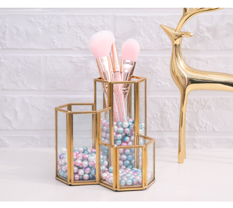 Hexagonal Transparent Glass Metal Makeup Brush Holder: Multi – functional Creative Desktop Beauty Tool Pen Holder