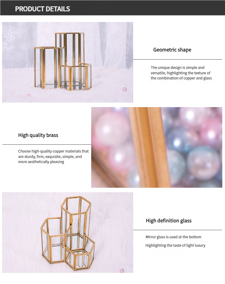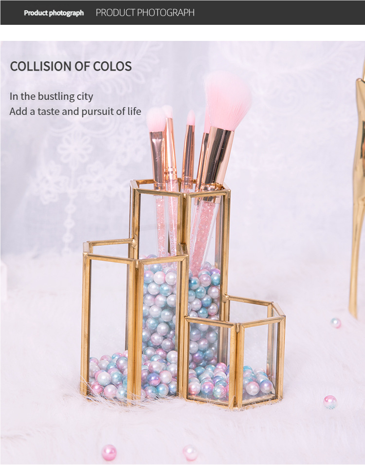 This creative hexagonal glass beauty organizer features a gold frame and colorful pearl decorations inside. It organizes makeup brushes and beauty tools separately, perfect for desktop display. The Nordic – style design adds elegance and romance to your beauty area.