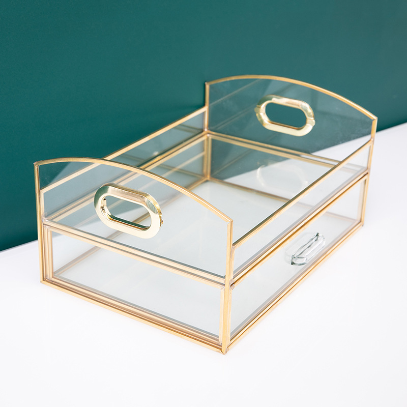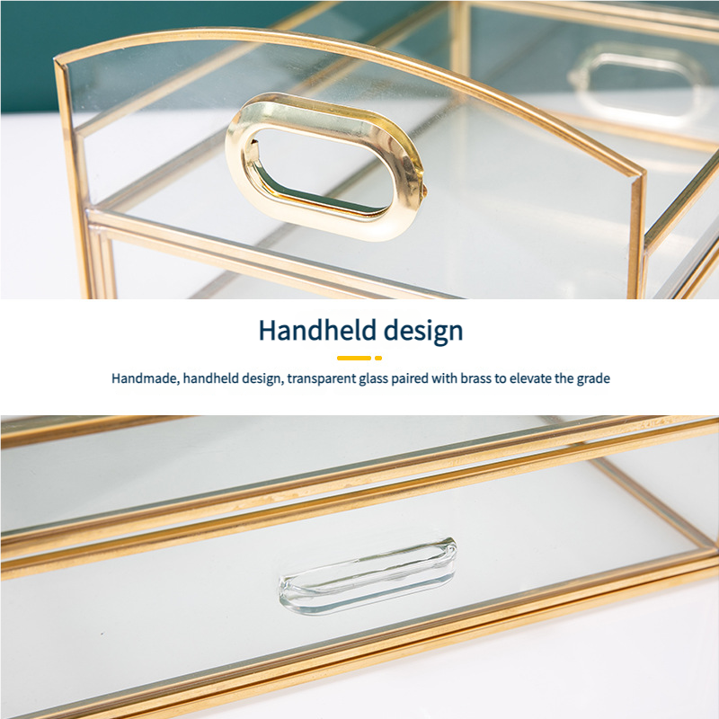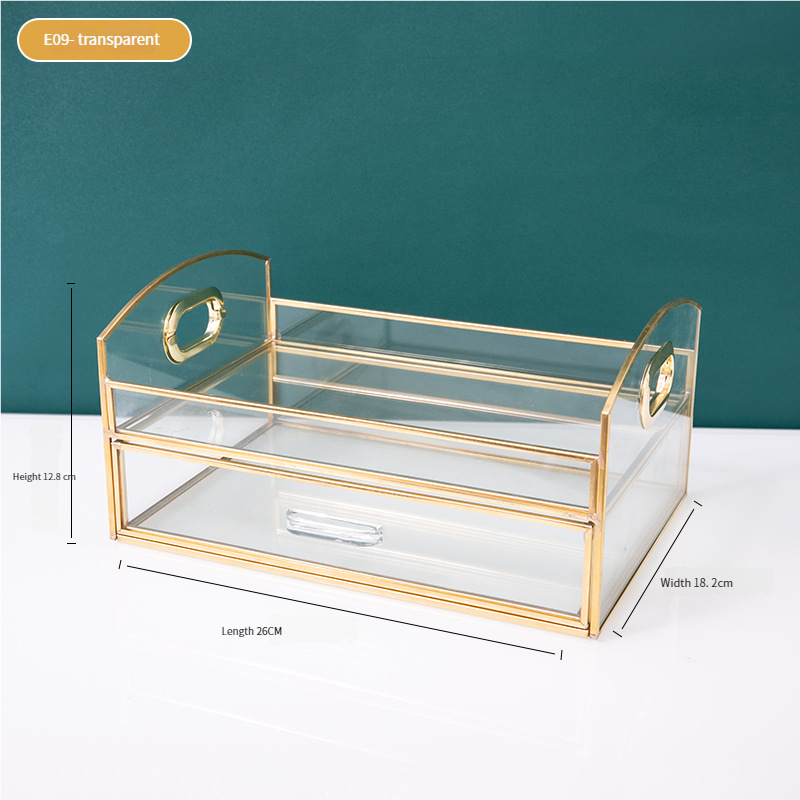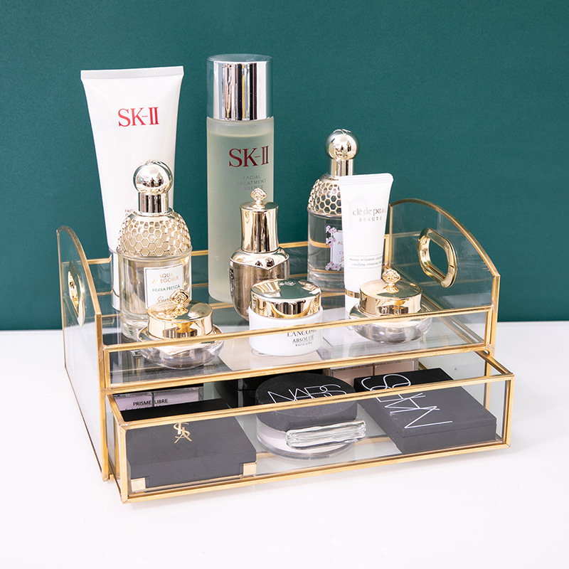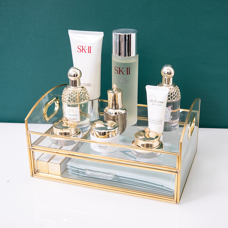 这款双层金框玻璃化妆收纳盒具有开放式上层和抽屉式下层,透明材料清晰地展示物品。金色边框体现了轻奢风格,非常适合梳妆台,整齐地整理护肤和彩妆产品,同时提高了存储效率和桌面的美感。