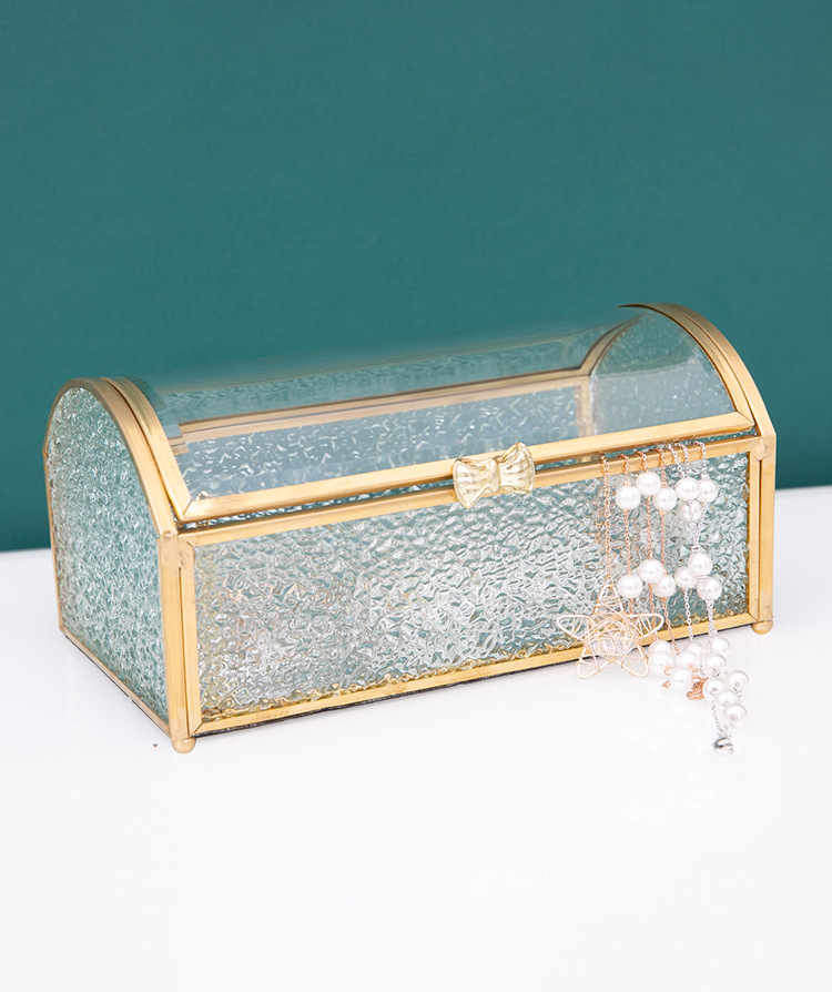 这款珠宝盒采用裂纹玻璃、金色镶边框架、拱形盖子和蝴蝶结装饰。其透明质感适合珠宝展示,保持物品无尘、优雅,为珠宝收纳增添轻盈奢华的氛围。