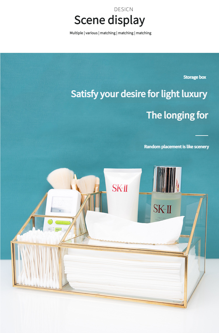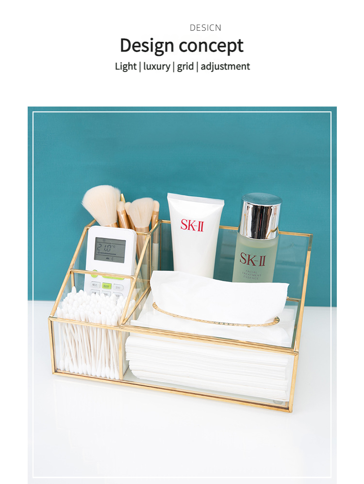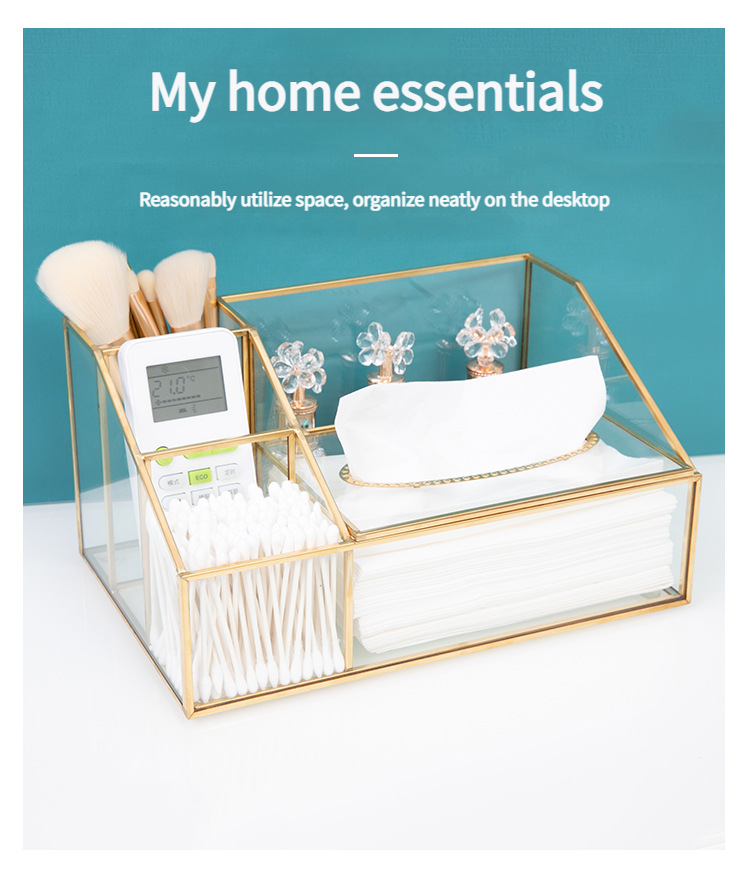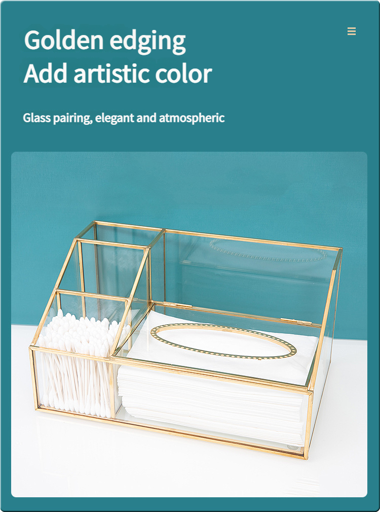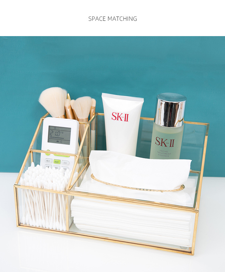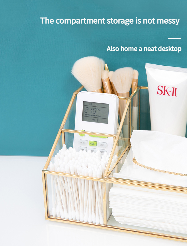 这款带有金色框架的多隔层玻璃收纳盒采用合理的隔断设计。它可以整齐地存放纸巾、棉签、美容工具和护肤品。金色边框搭配透明玻璃,散发着轻奢气息,适合梳妆台或桌面使用,让物品井井有条,增强整洁度。