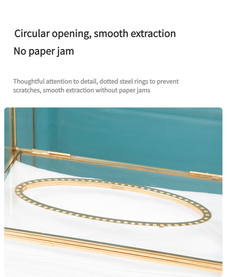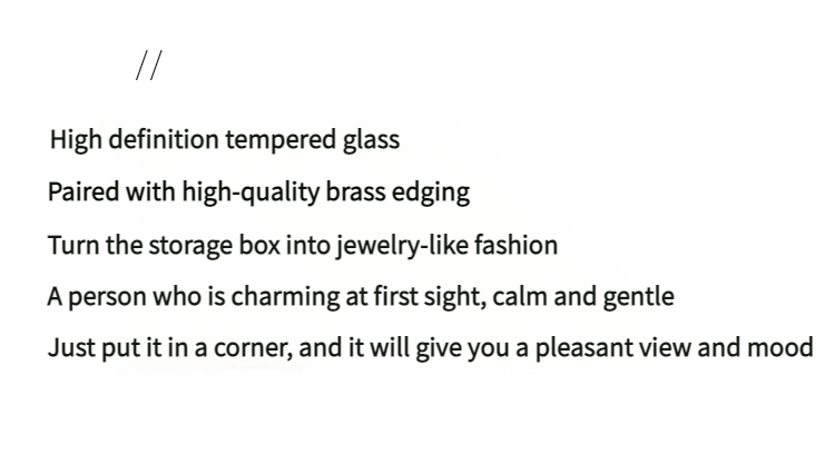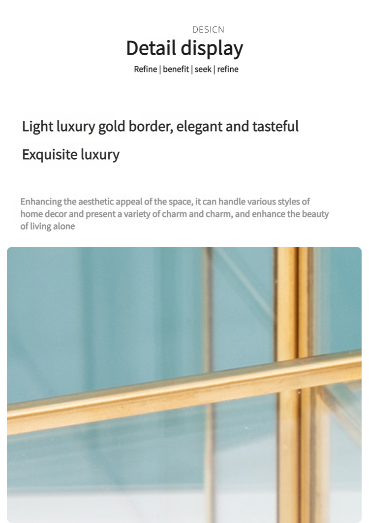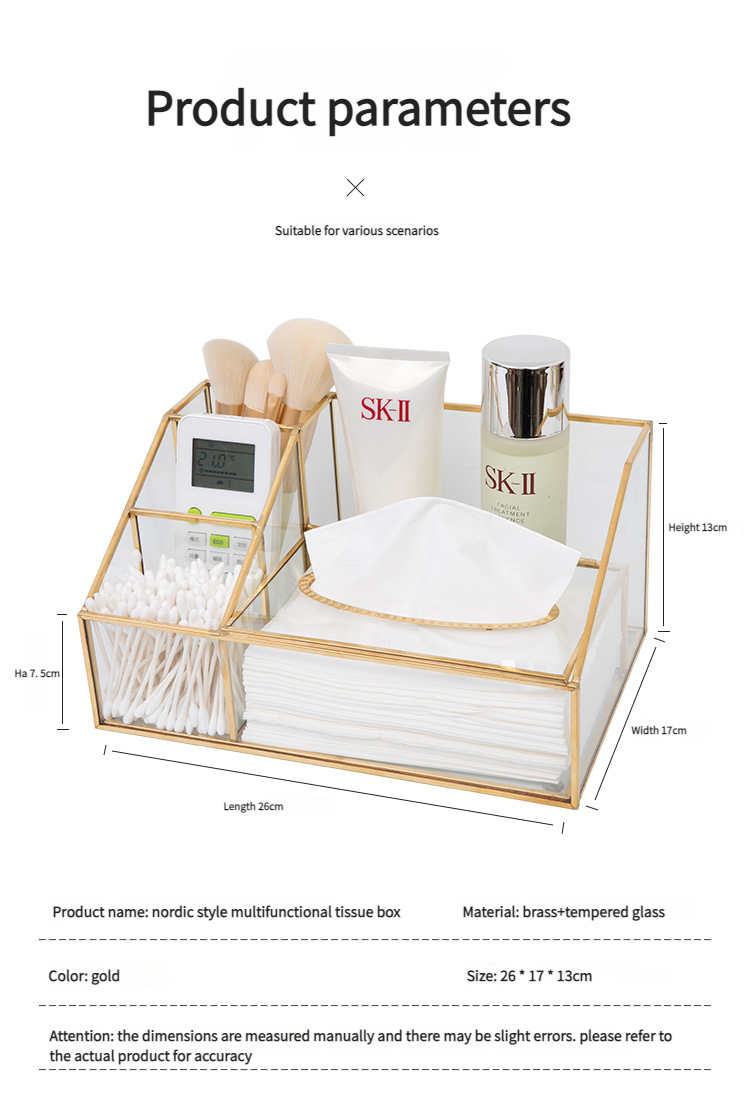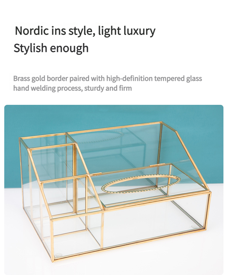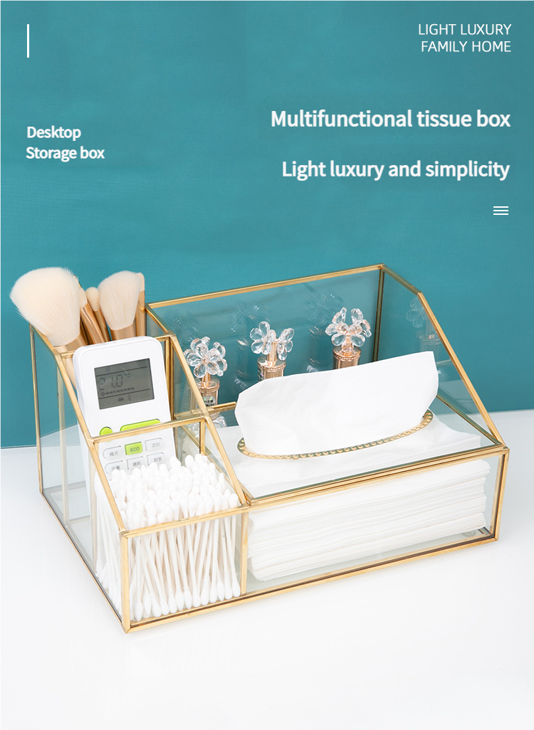 这款带有金色框架的多隔层玻璃收纳盒采用合理的隔断设计。它可以整齐地存放纸巾、棉签、美容工具和护肤品。金色边框搭配透明玻璃,散发着轻奢气息,适合梳妆台或桌面使用,让物品井井有条,增强整洁度。