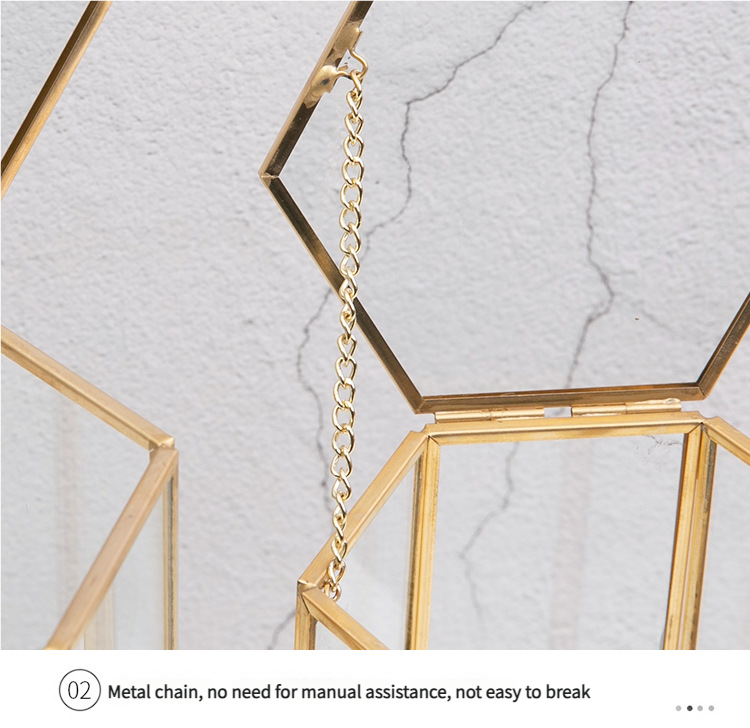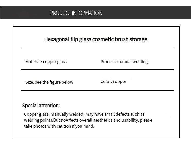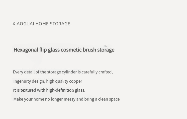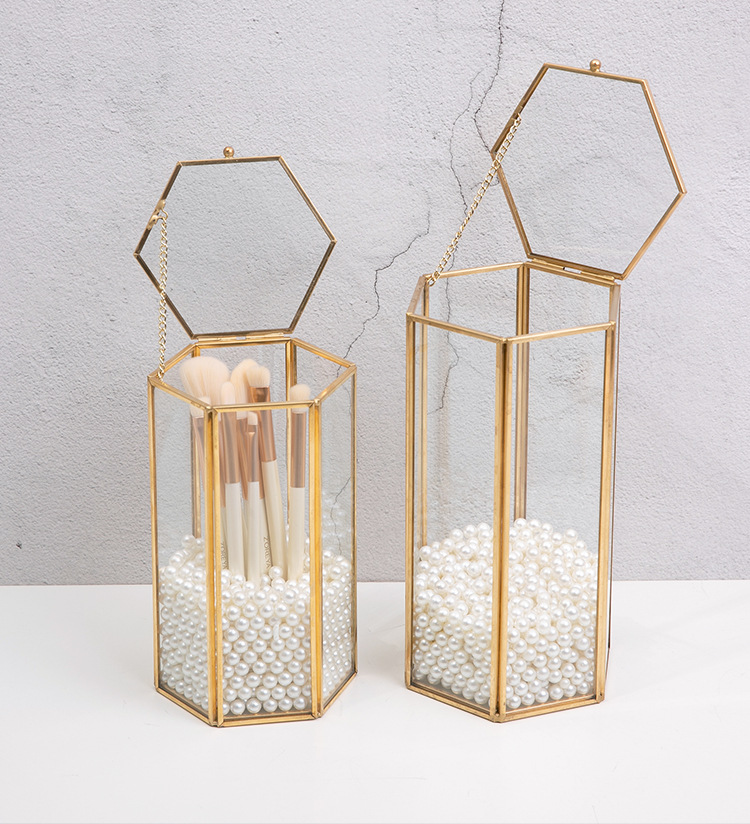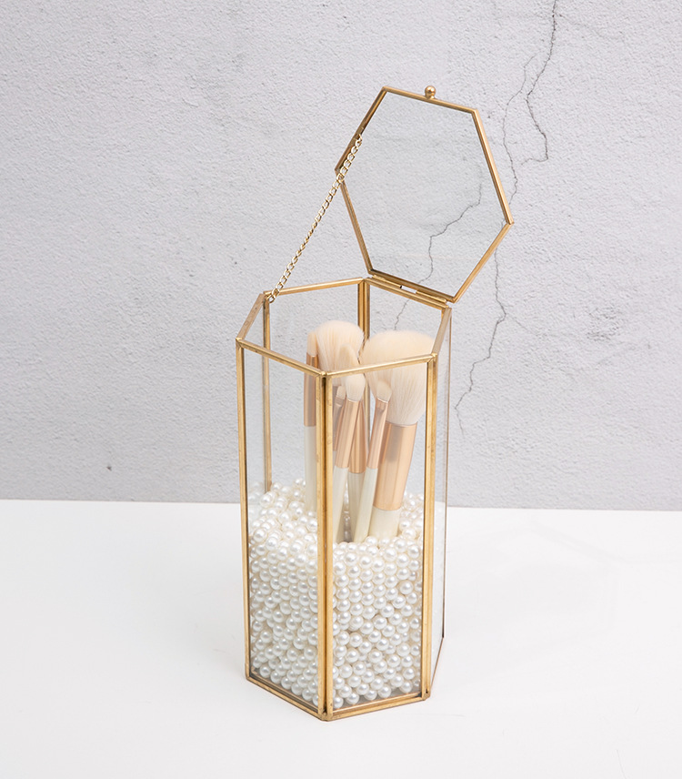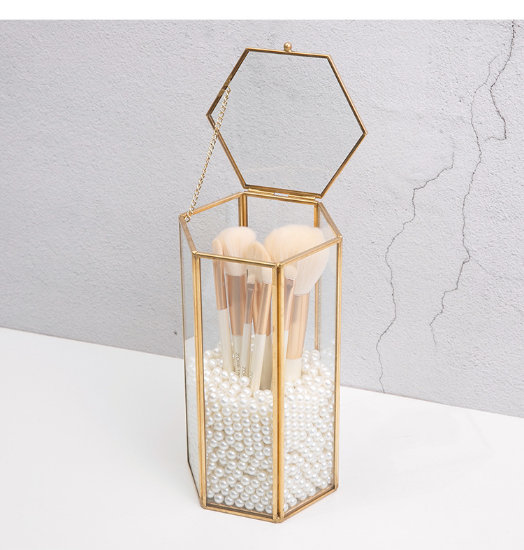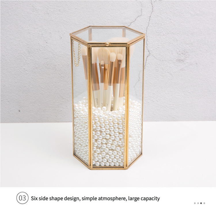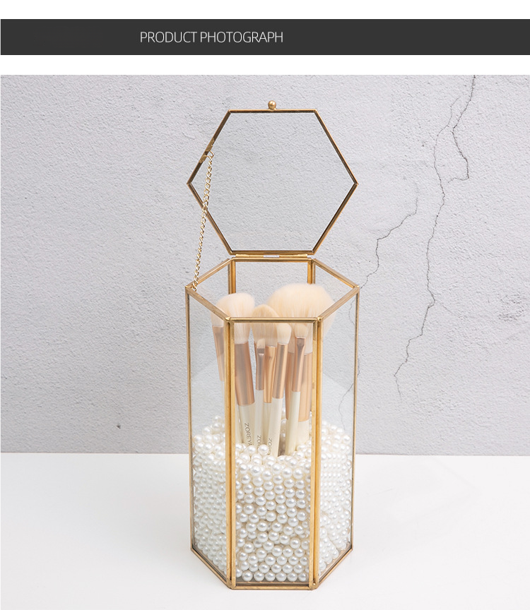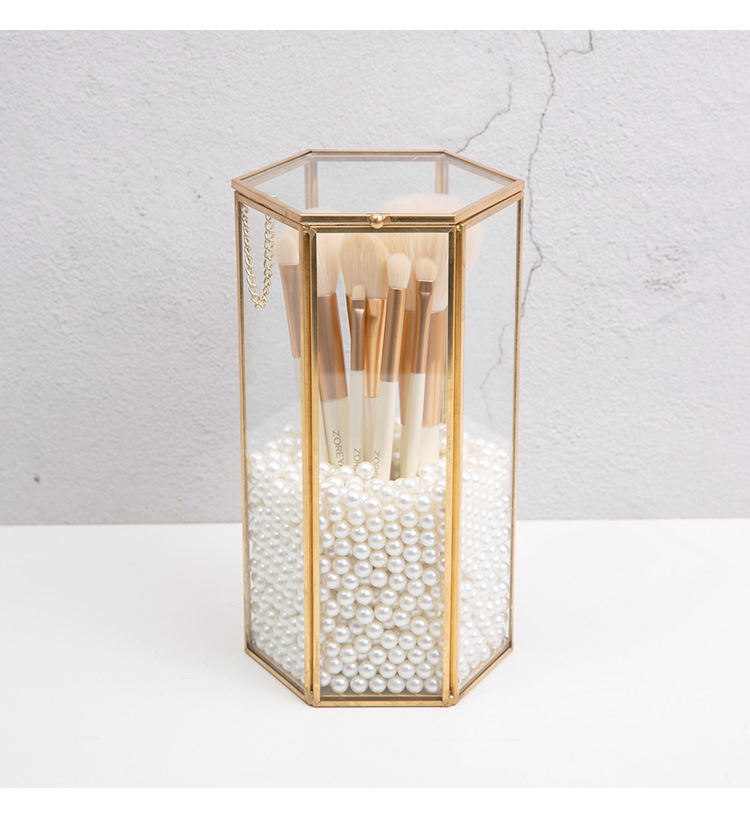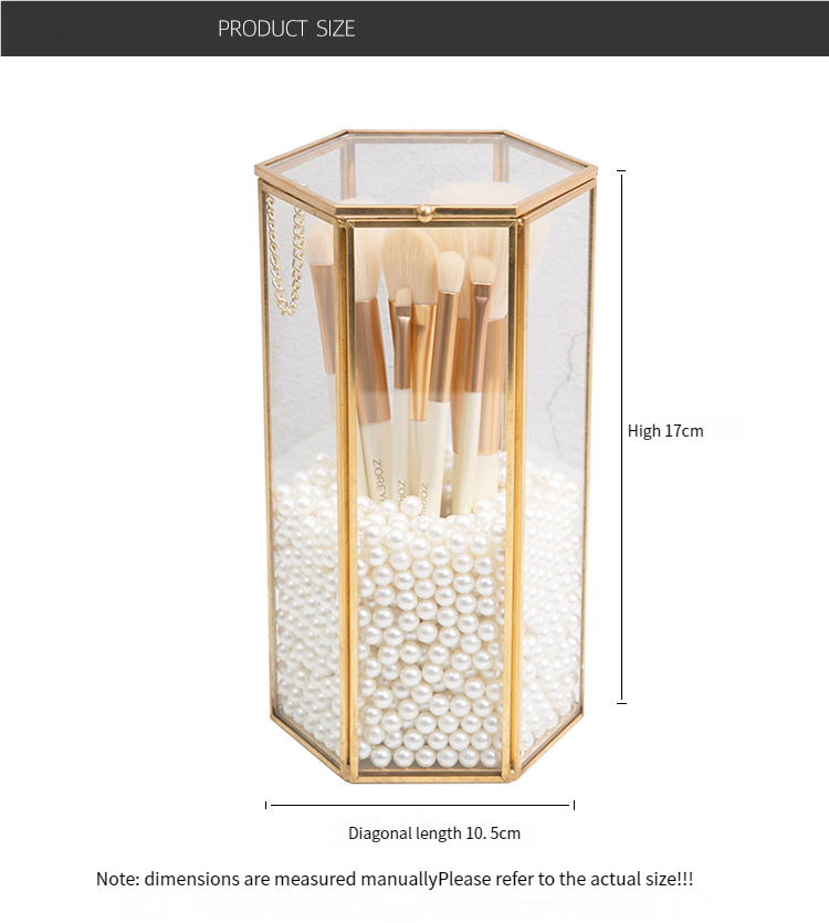 这款六边形玻璃化妆刷收纳盒,内有精致的金色边框和珍珠填充物,可以收纳化妆刷防尘。透明可见设计适合桌面使用,将美观与实用性相结合,保持美容工具整洁,为梳妆台增添轻奢感。