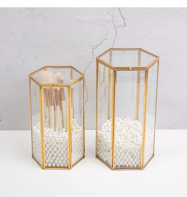 这款六边形玻璃化妆刷收纳盒,内有精致的金色边框和珍珠填充物,可以收纳化妆刷防尘。透明可见设计适合桌面使用,将美观与实用性相结合,保持美容工具整洁,为梳妆台增添轻奢感。