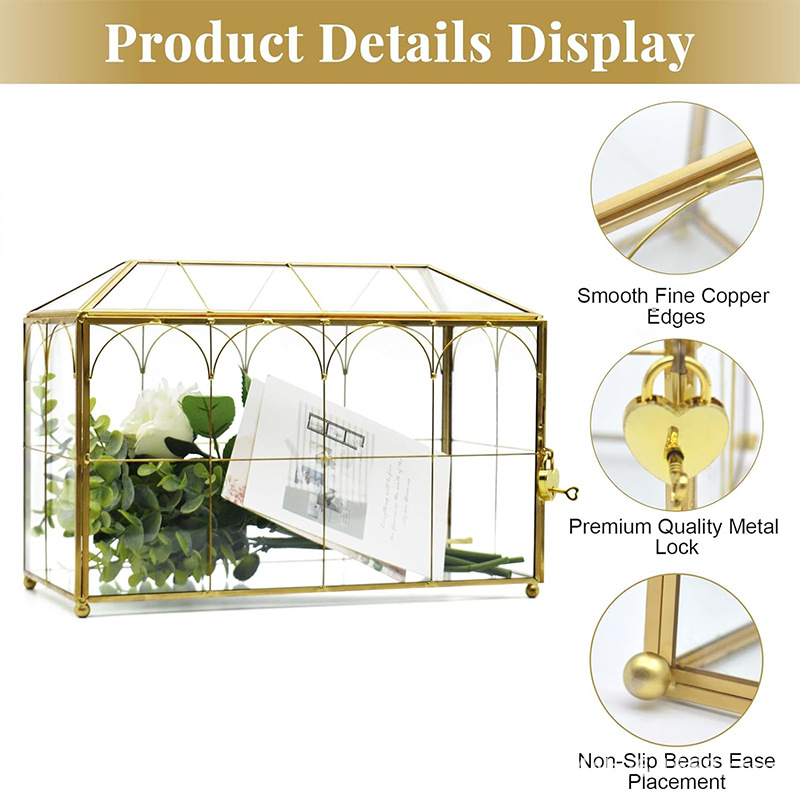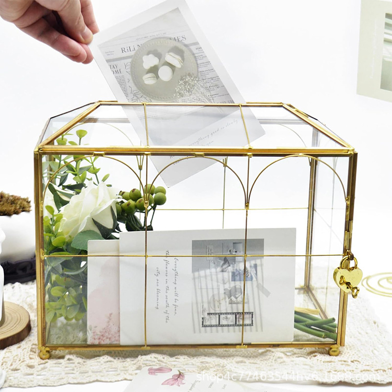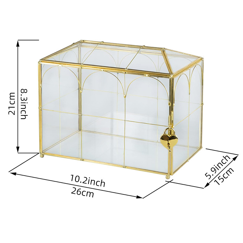 这款房子形状的金色框架玻璃储物盒配有心形锁。透明设计清晰地展示了里面的物品,非常适合存放信件、纪念卡和其他珍贵纪念品。其轻奢风格为任何空间增添了优雅的气息,使其成为装饰和整理的完美选择。