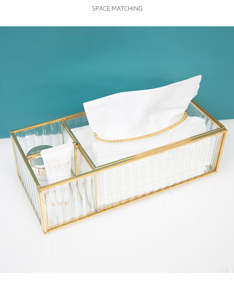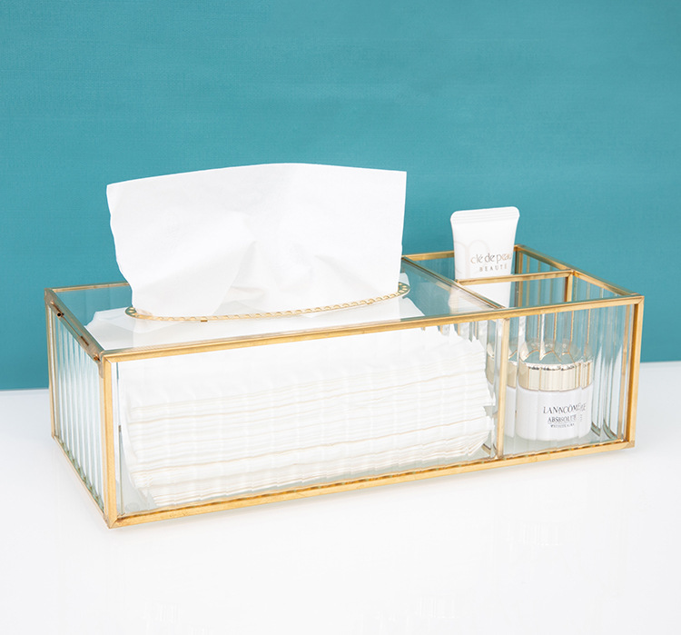 这款透明玻璃纸巾盒采用精致的金色框架轮廓和双隔层设计。主部分存放纸巾,而侧隔层则存放护肤品等小物品。它非常适合桌面使用,轻巧、奢华、有吸引力且实用,可保持桌面整洁有序。