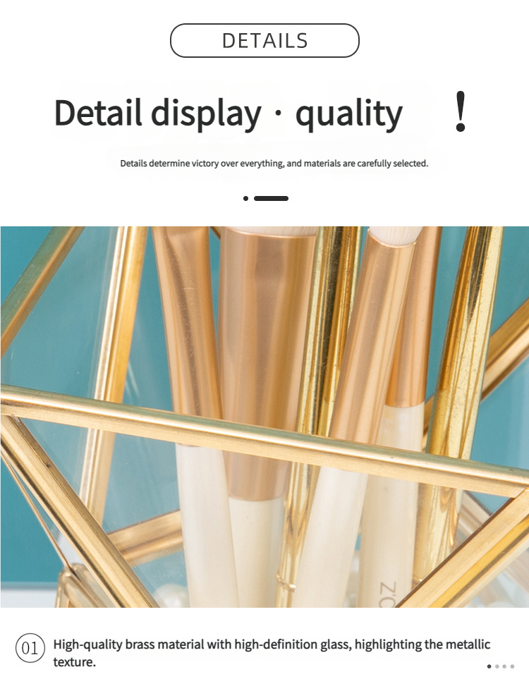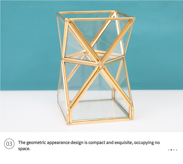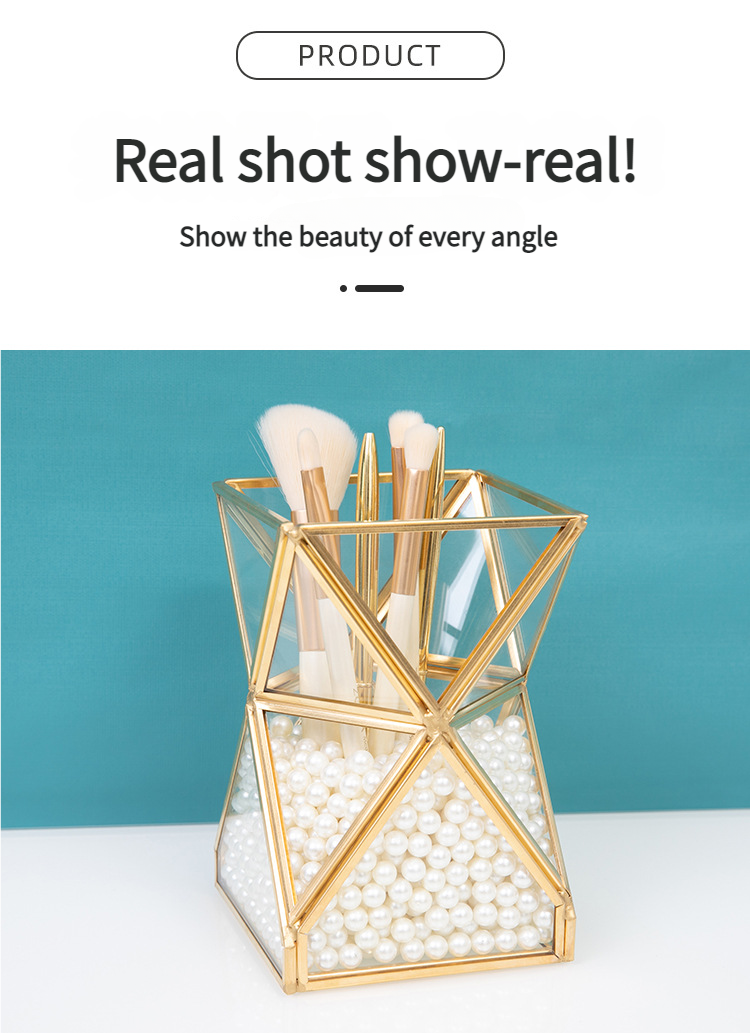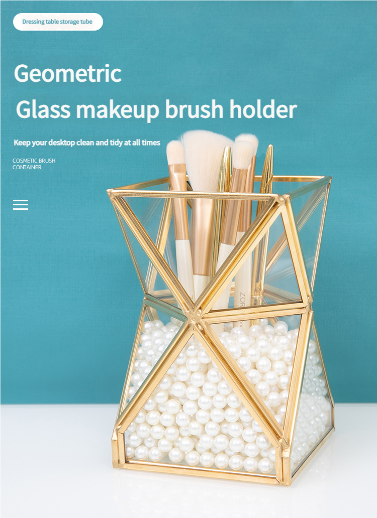 这款几何框架的金色玻璃化妆刷架,底座上饰有珍珠,可整齐地整理化妆刷。金色几何设计搭配透明玻璃,散发着轻奢气息,非常适合梳妆台,为美容工具营造出优雅的展示区。