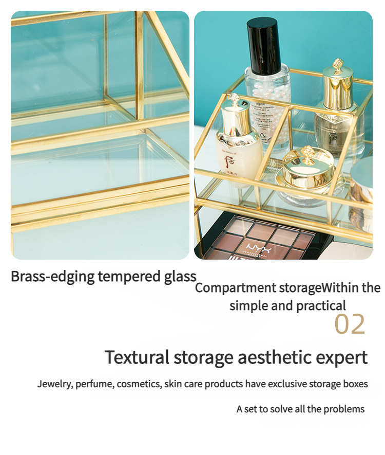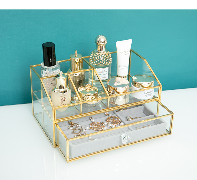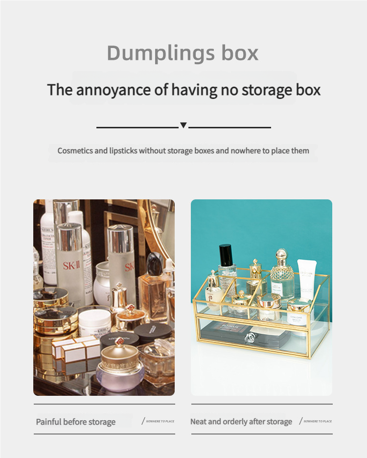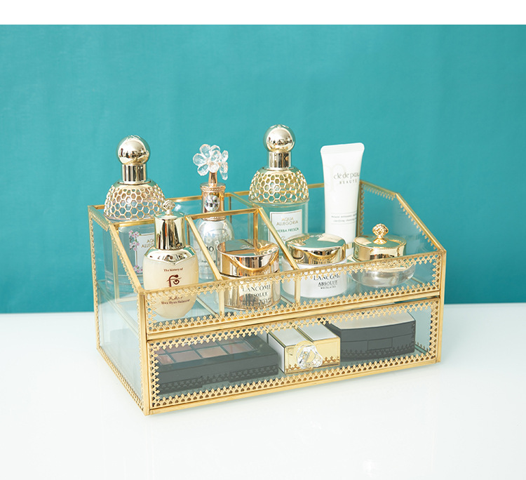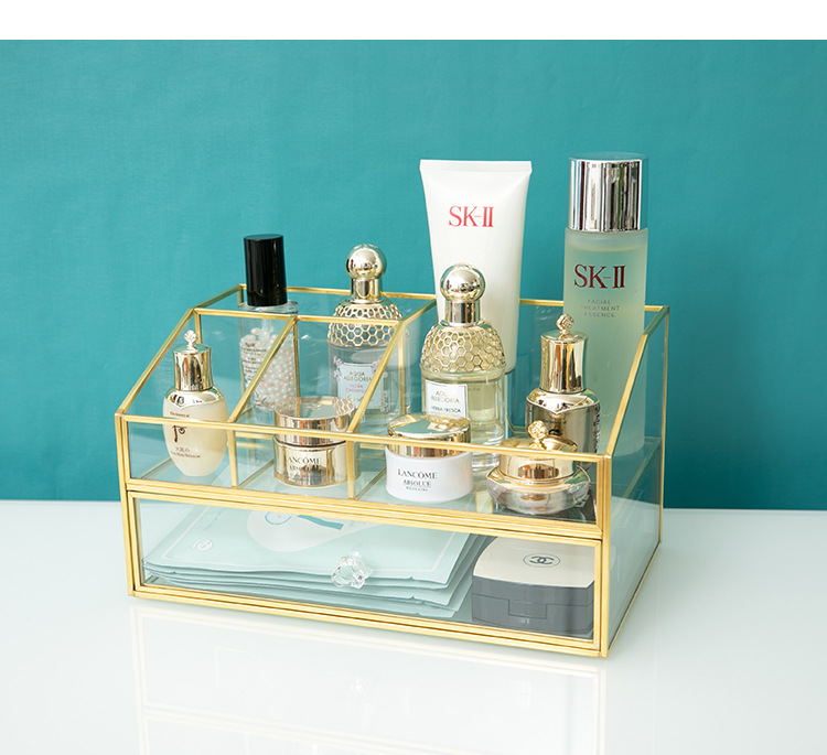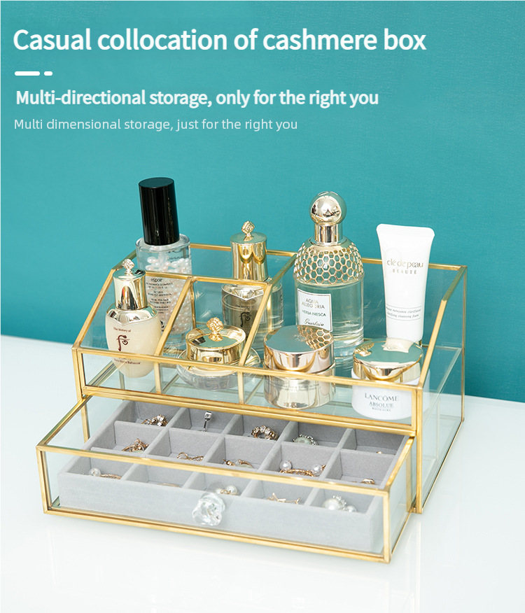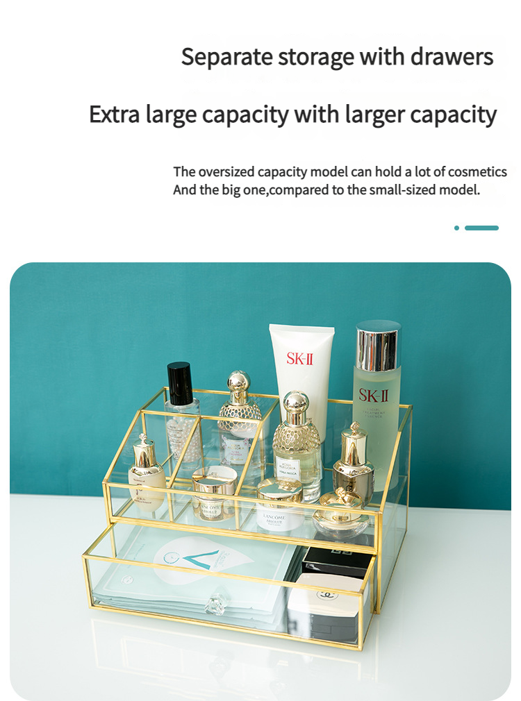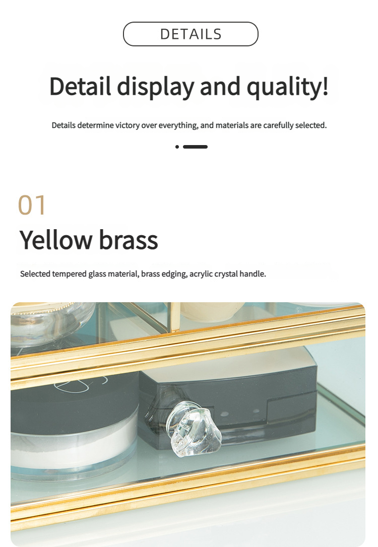 This double – layer glass beauty organizer features a sleek gold frame and transparent material for clear item display. The upper layer has compartments for skincare products and beauty tools, while the lower drawer stores cosmetics. Perfect for desks and vanities, it keeps items dust – free and organized, creating a tidy beauty space.
