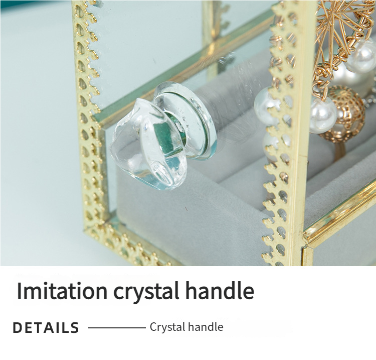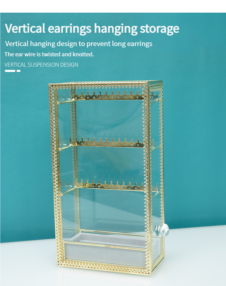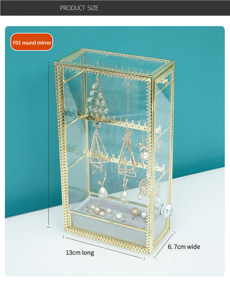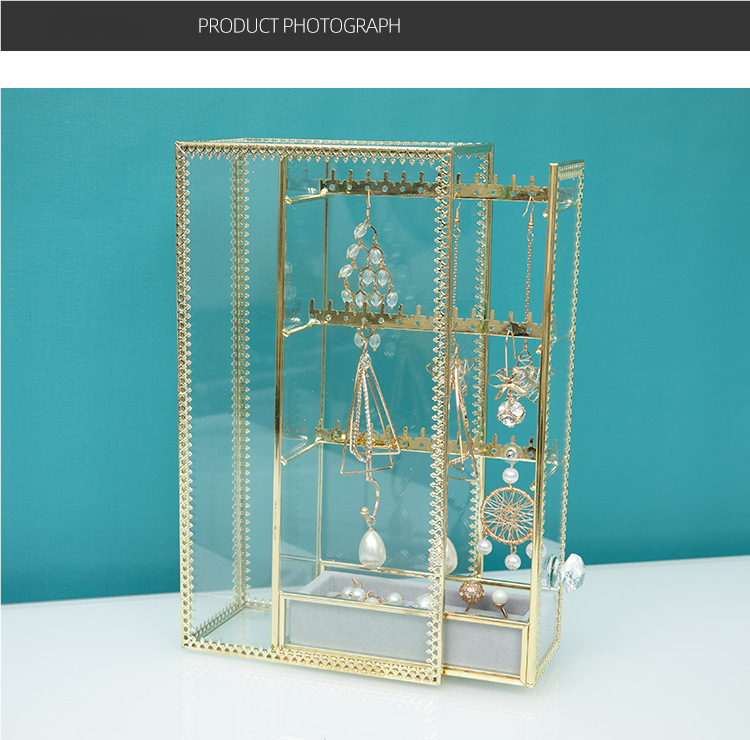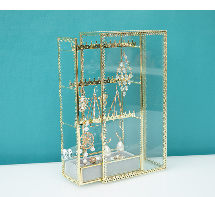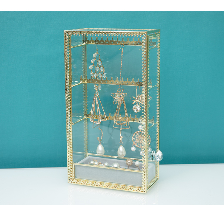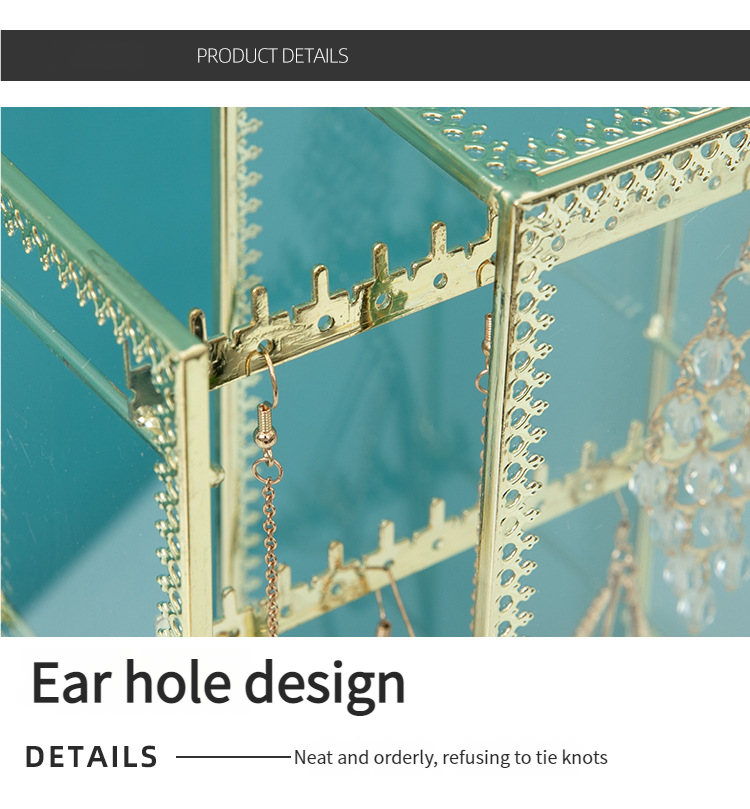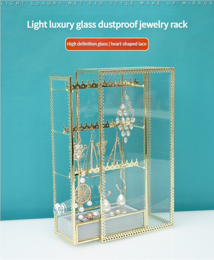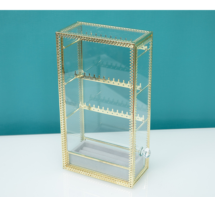 Transparent Glass Dustproof Jewelry Storage Box – Metal Display Stand for Earrings, Ear Accessories, Rings & Desktop Jewelry Showcase