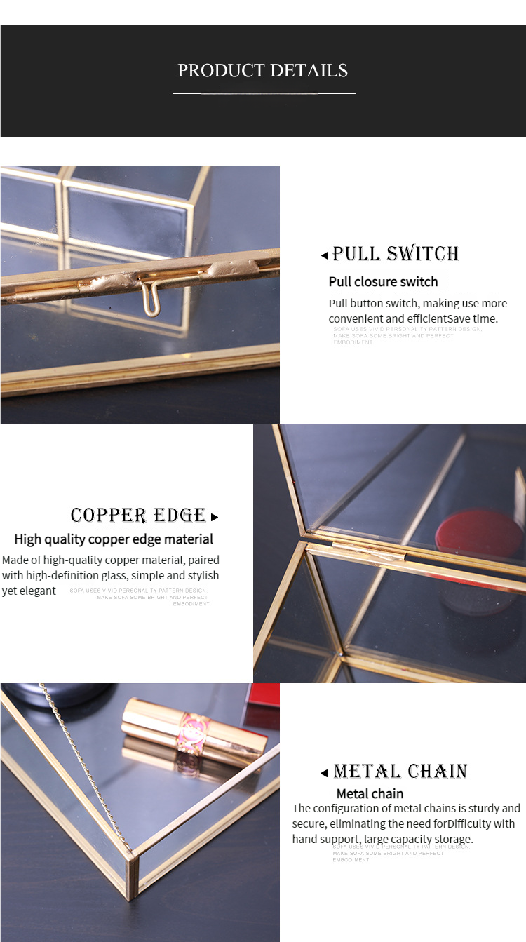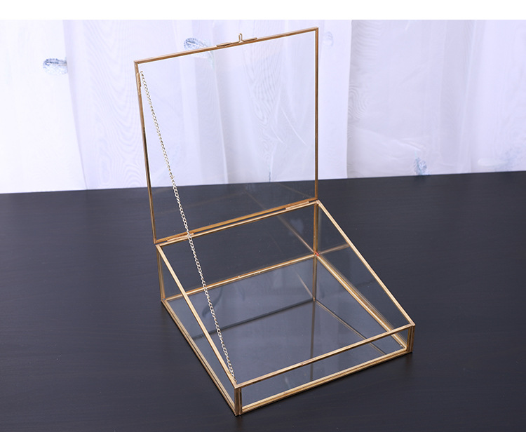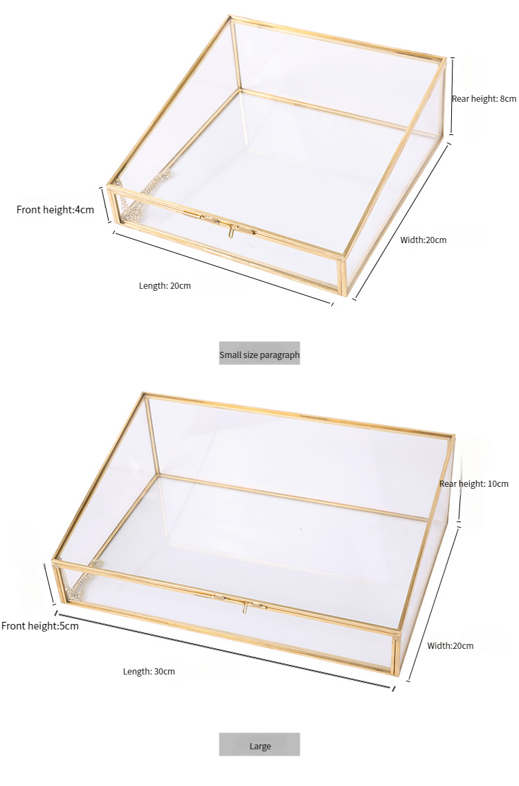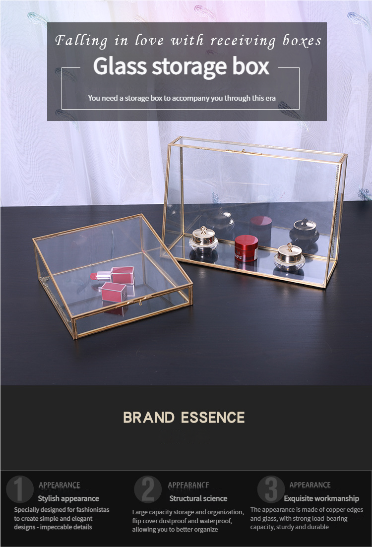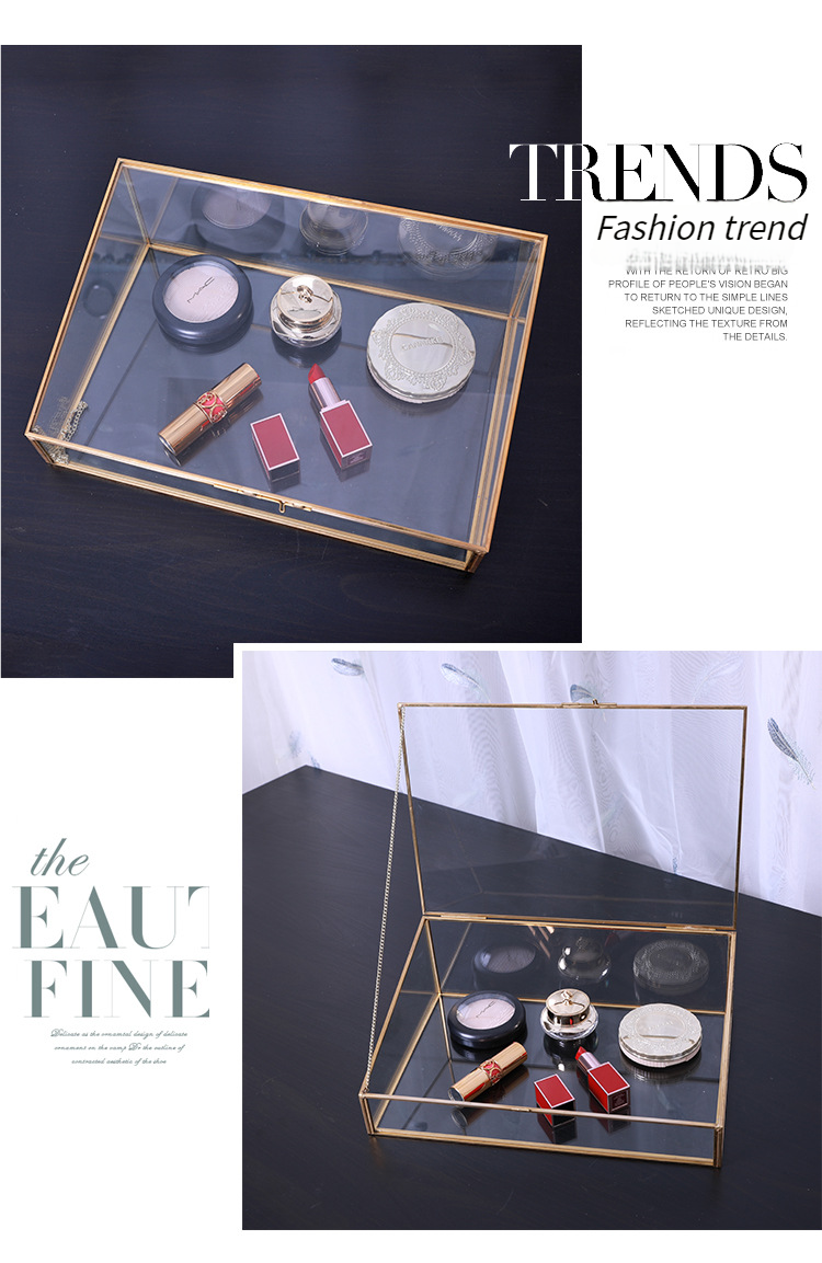 This trapezoidal brass – trimmed glass storage box features a transparent body with a gold frame and a lid for dust protection. Ideal for displaying cosmetics and jewelry on desktops, it combines light – luxury style with practicality, creating an organized and tidy storage space.