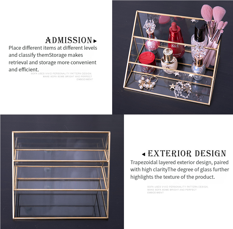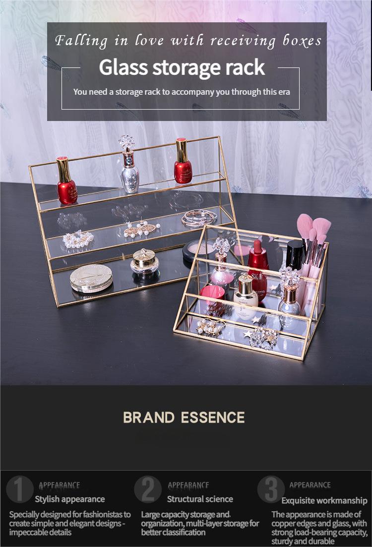 This multi – layer glass cosmetic organizer features a golden metal frame and transparent glass for an elegant look. With layered design, it neatly stores and displays beauty products like perfumes, skincare items, and makeup brushes. Adding a touch of light luxury to the dressing table, it keeps the desktop tidy and stylish.
