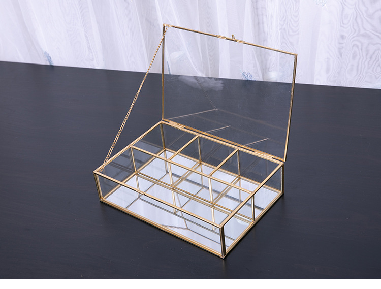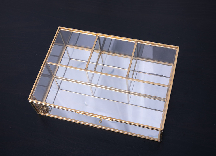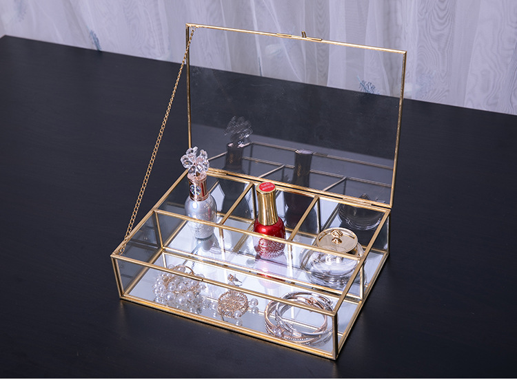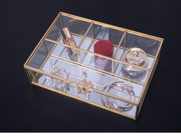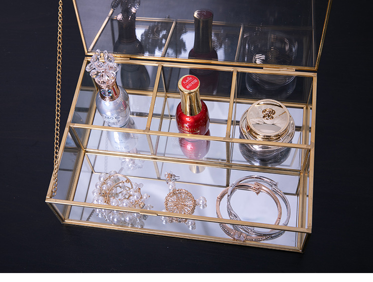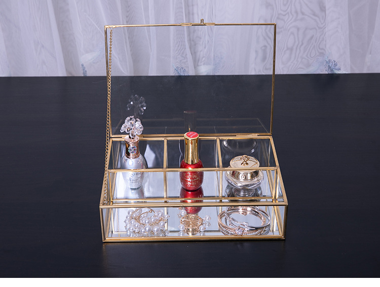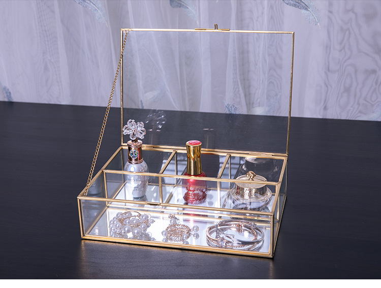 This vintage – style glass storage box features a gold frame and mirrored design. With multi – compartments, it organizes jewelry and cosmetics separately. The flip – top lid prevents dust, combining elegance and practicality to create a neat, light – luxury storage space for your desktop.