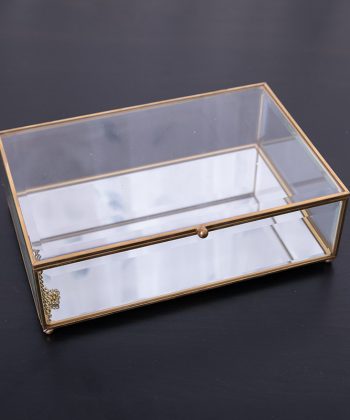 这款玻璃首饰盒采用精致的金色框架、透明玻璃和镜面底座。它可以存放珠宝和小物品,防止灰尘进入,同时为桌面增添一丝轻奢。整理美容产品和配饰的完美选择。