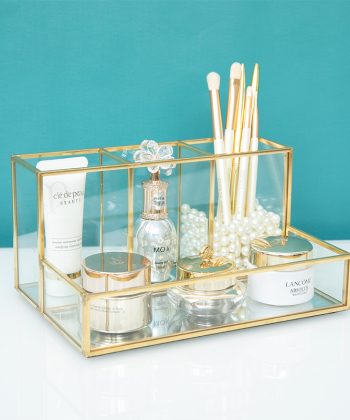 Brass and Glass Storage Container for Nail Art, Eyebrow Pencil & Colored Brushes – Transparent, Uncovered Desktop Organizing Storage Box for Skincare Products & Perfume
